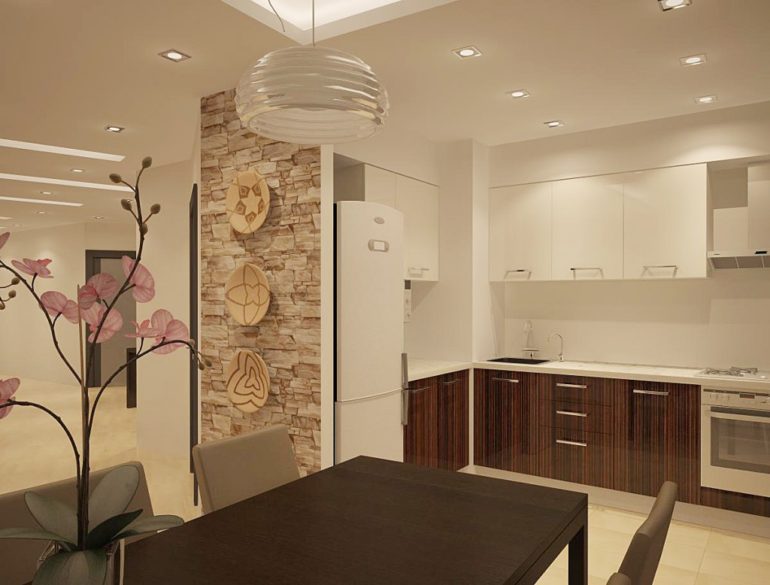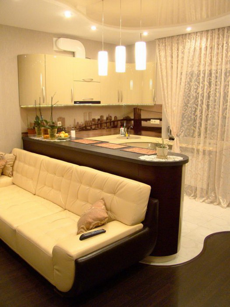 - Capacidade de aumentar o espaço livre. A conexão das duas salas possibilita não apenas ampliar visualmente a sala, mas também proporcionar um amplo espaço durante o cozimento e a execução de outras ações de rotina. Se você adicionar muitas lâmpadas pequenas, poderá criar um efeito de luz extraordinário.