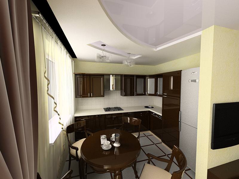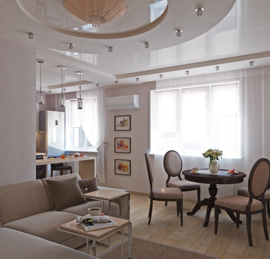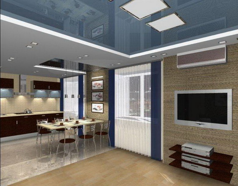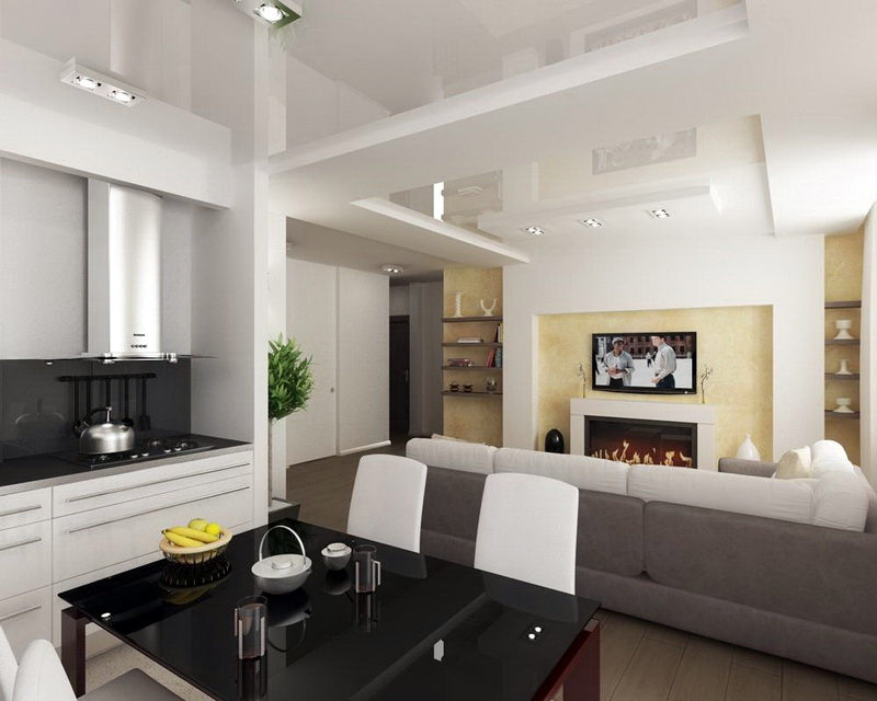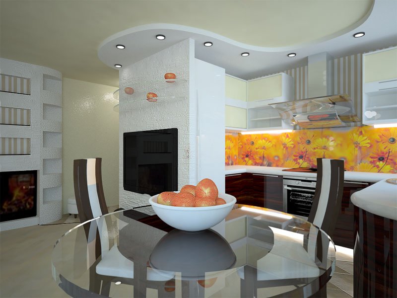O teto falso permite que você se concentre na combinação do espaço da cozinha e da sala de estar. Instalando corretamente esse design, você pode aumentar visualmente o espaço, dar à sala uma aparência moderna.