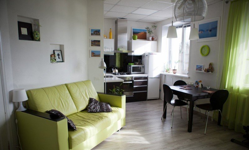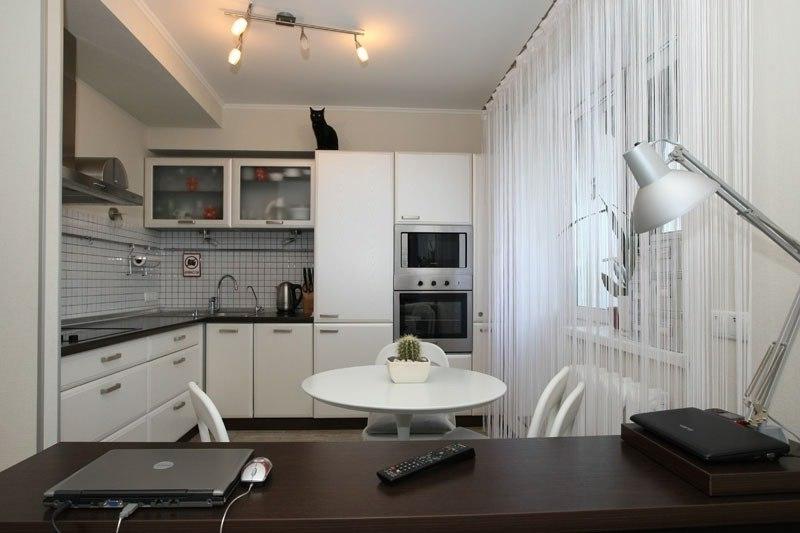 A sala da cozinha é uma boa solução para apartamentos pequenos. Esta é uma boa oportunidade para dividir o espaço e tornar a sua casa moderna.