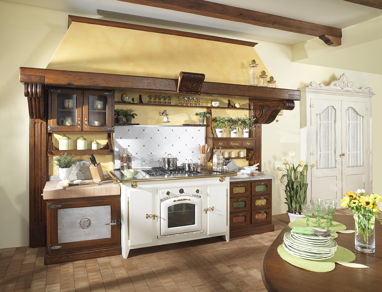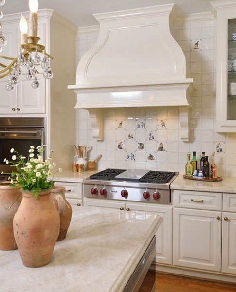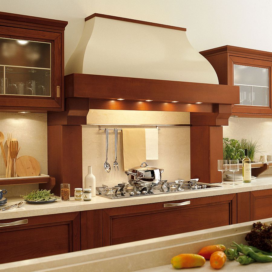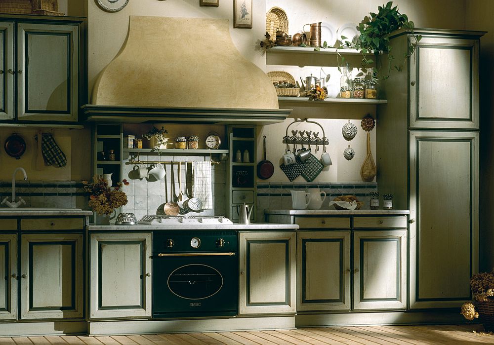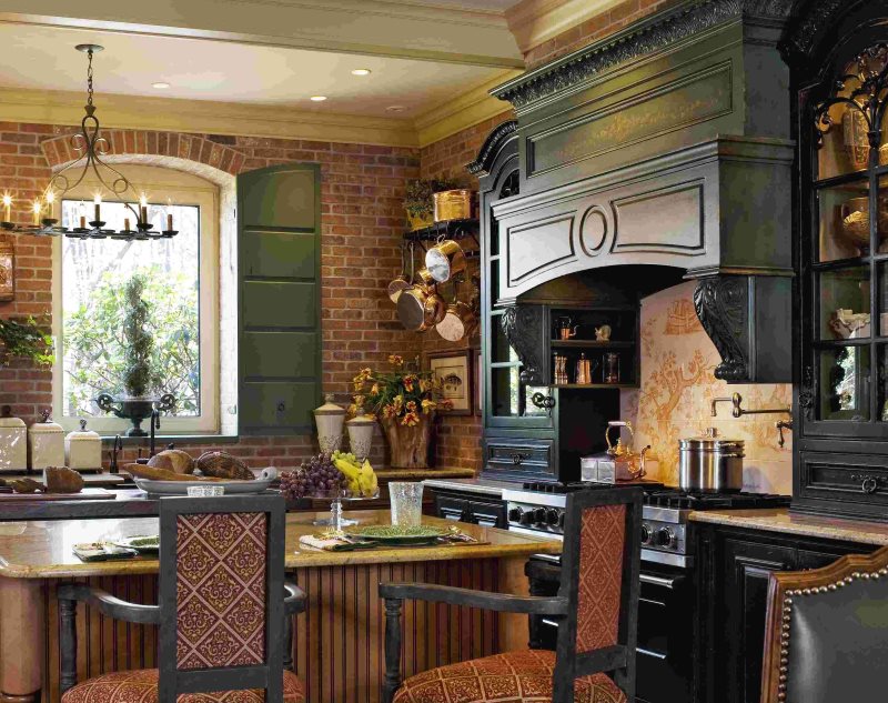 Exaustor embutido com um portal em forma de lareira na cozinha no estilo da Provence