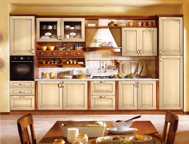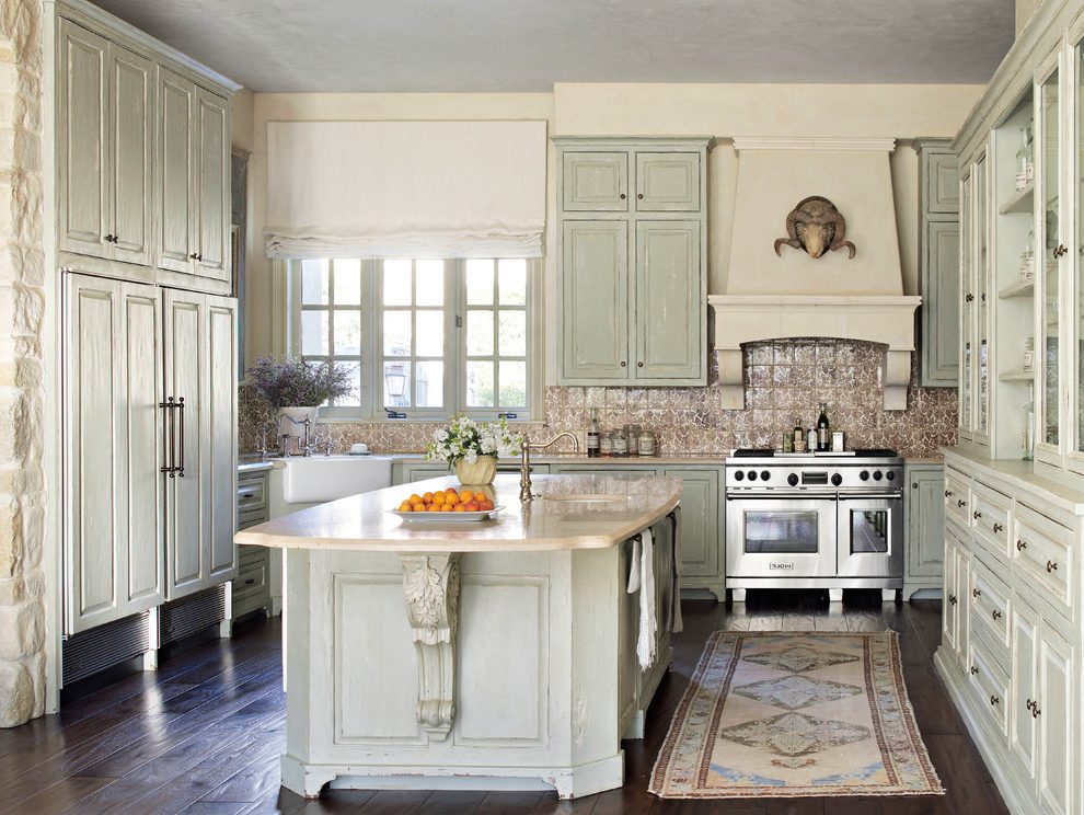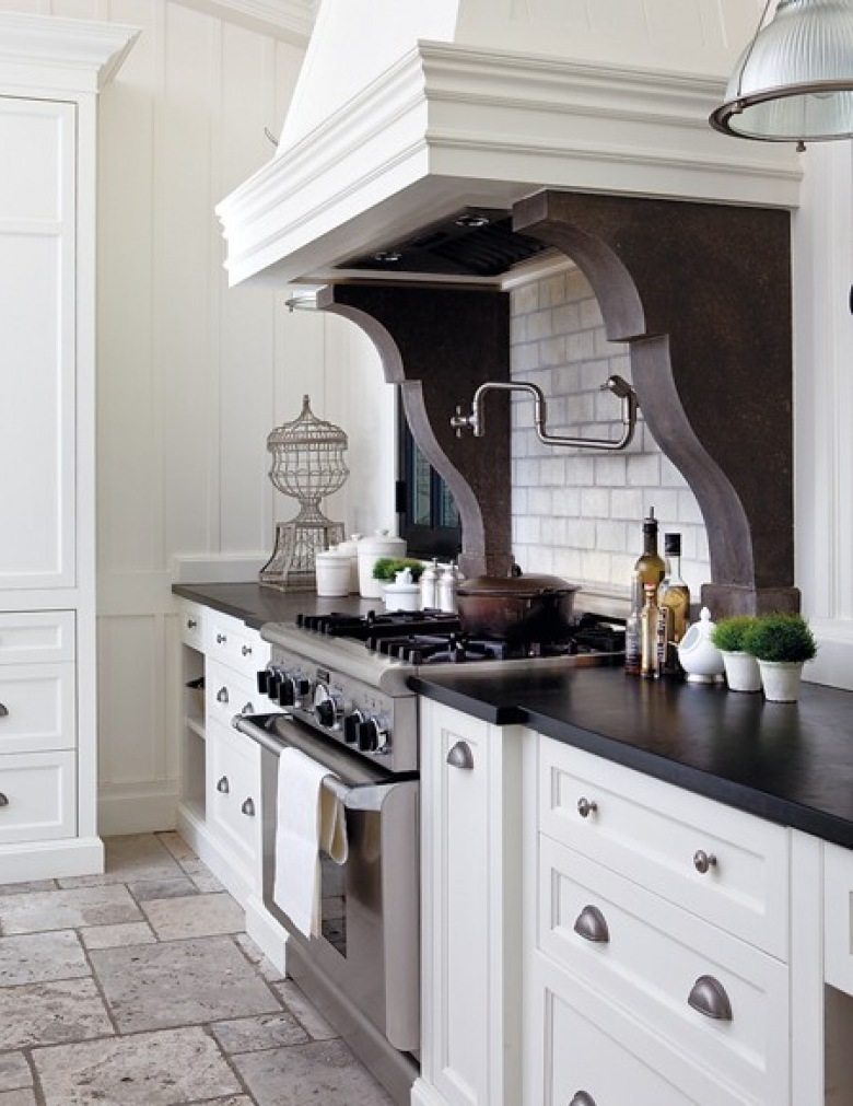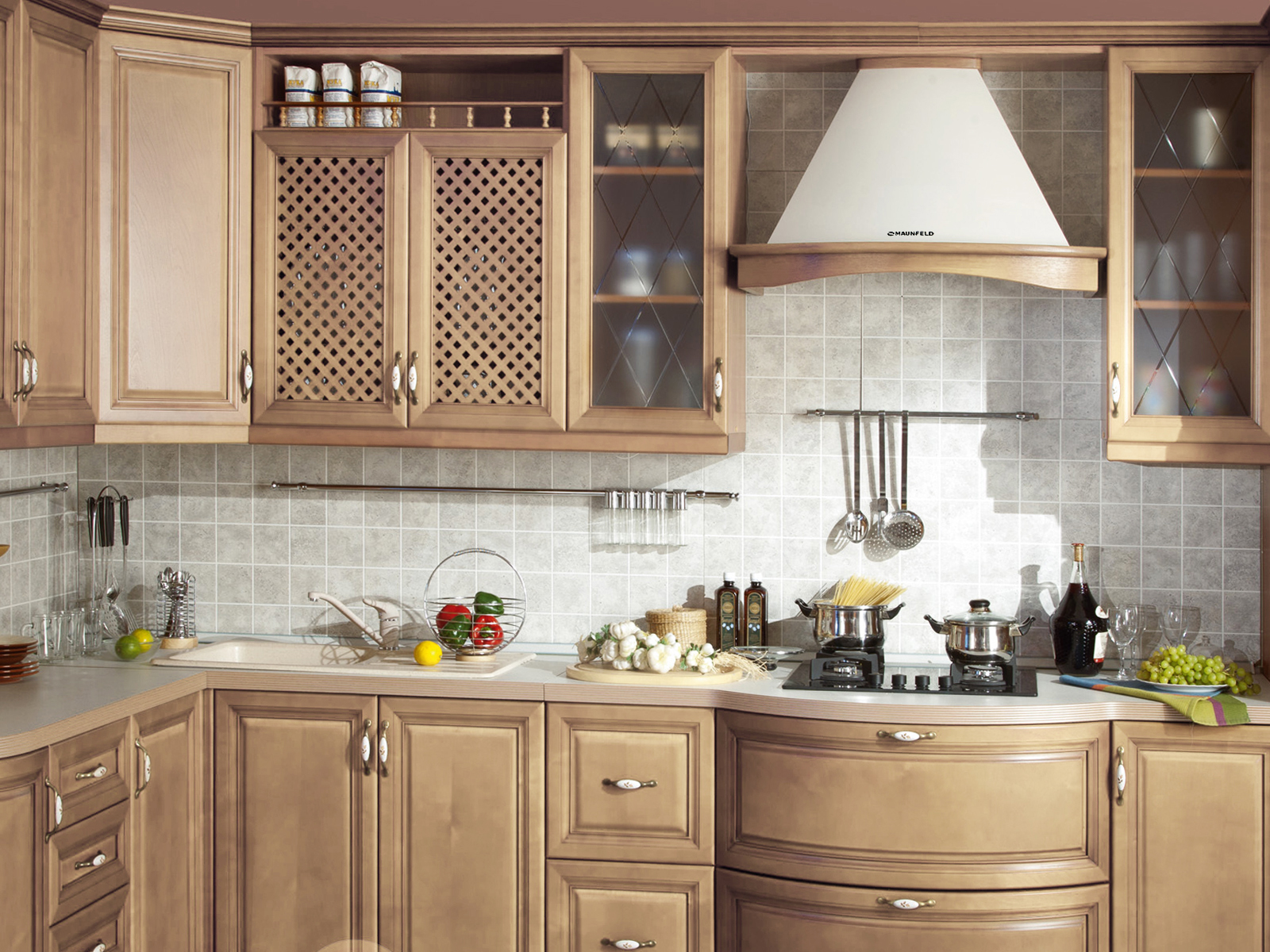 Exaustor embutido com um portal em forma de lareira na cozinha no estilo da Provence