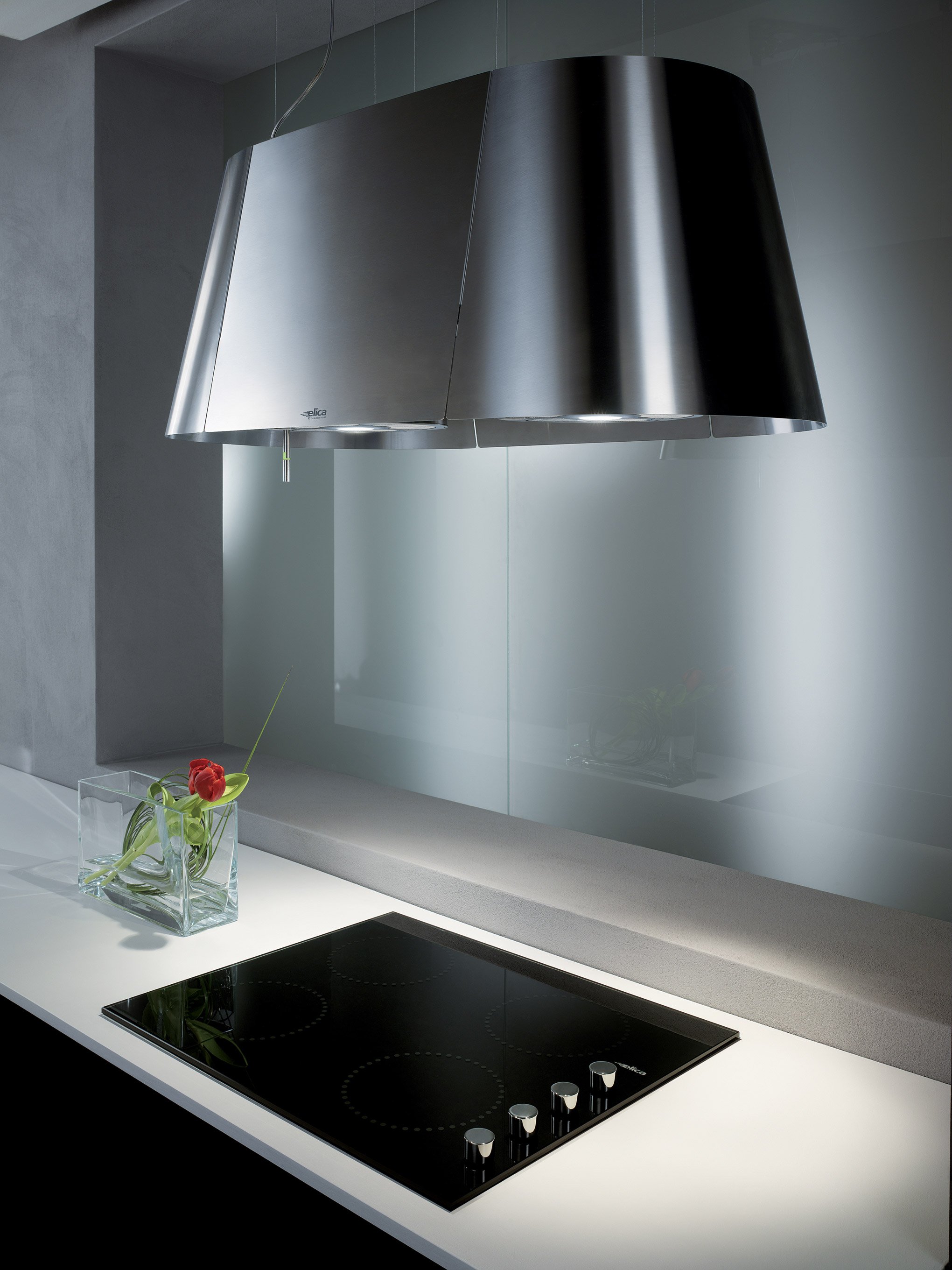Um exaustor de ilha é relevante se o fogão estiver no centro da cozinha e não estiver ao lado de nenhuma das paredes. Às vezes usado como a principal fonte de luz. Parece harmoniosamente na cozinha em estilo moderno ou oi-tech.