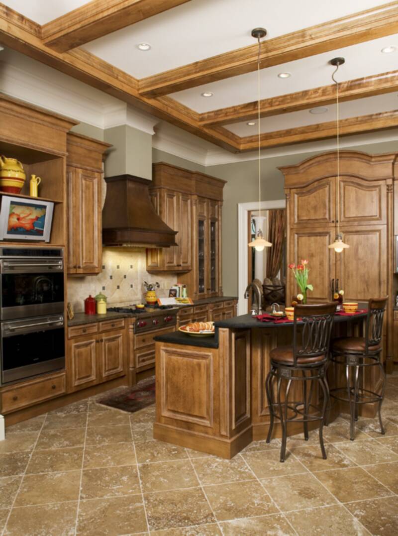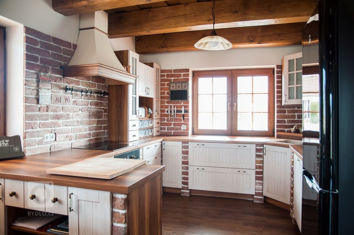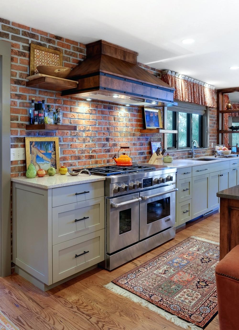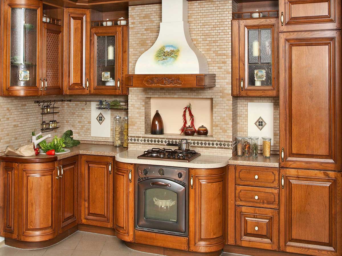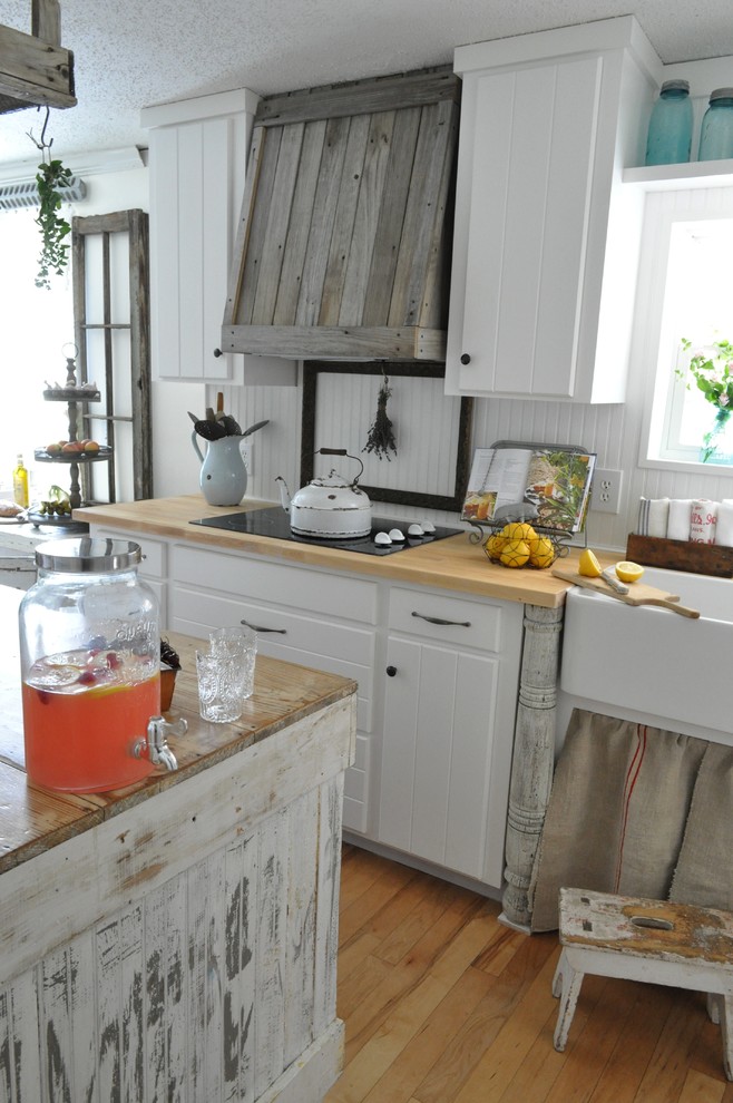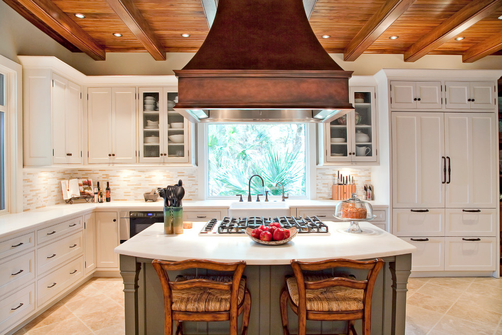 Exaustor de canto com molduras de madeira na cozinha campestre
