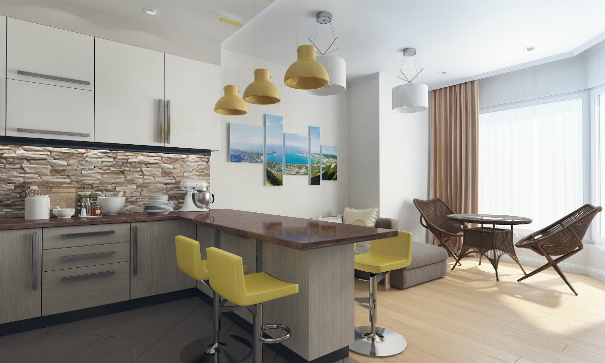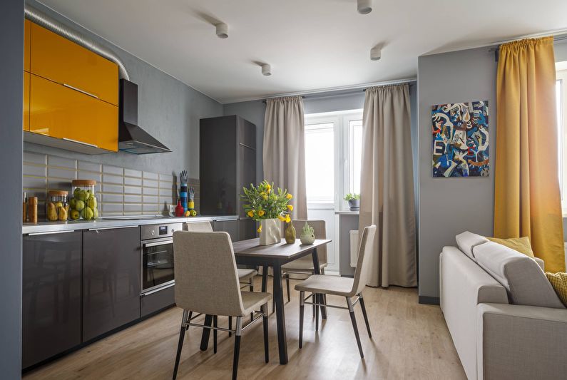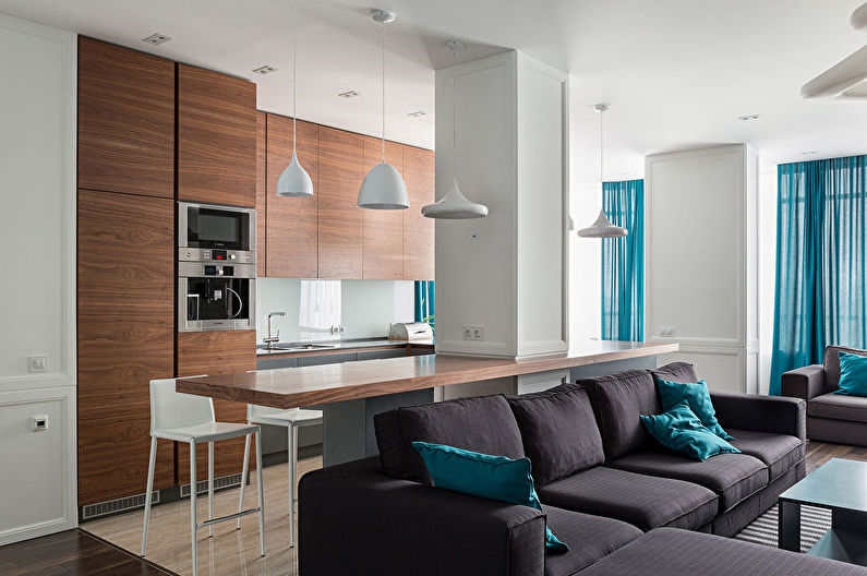 Exemplo: Design de cozinha de sala de estar. Foto 2020. Idéias modernas.