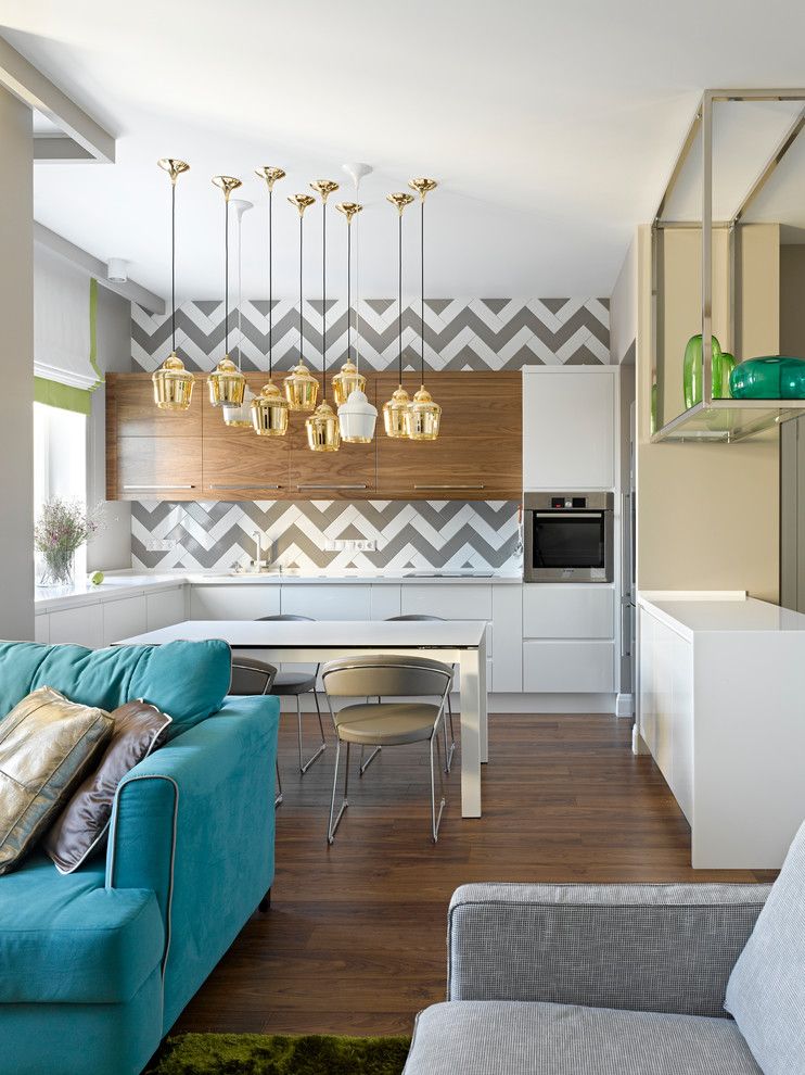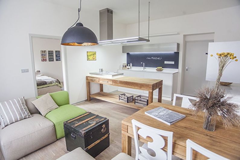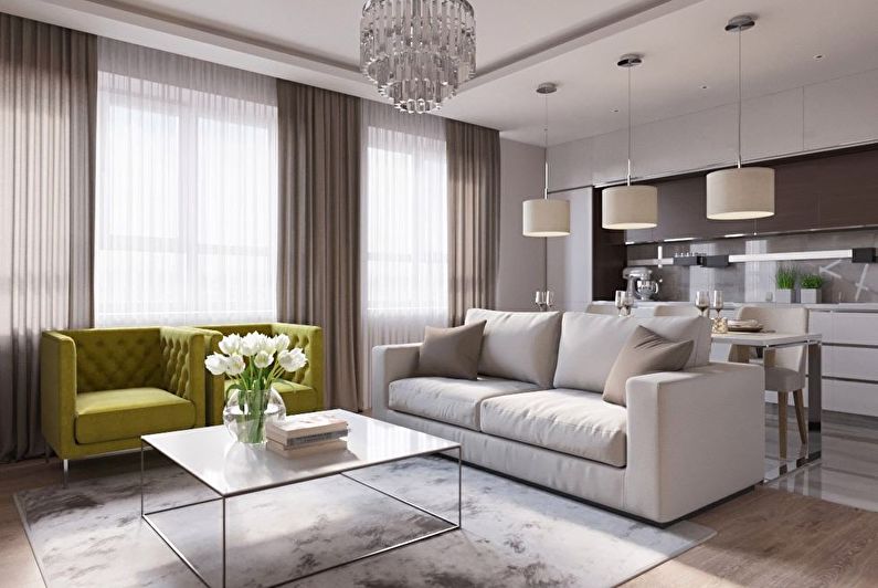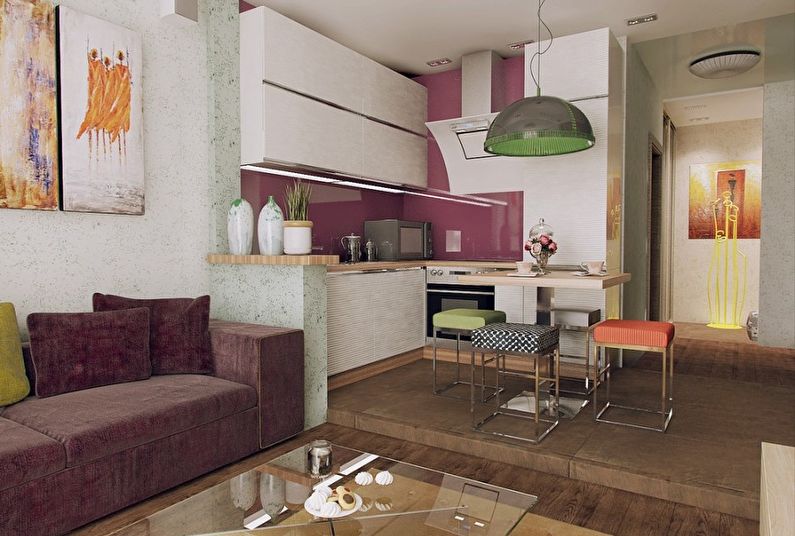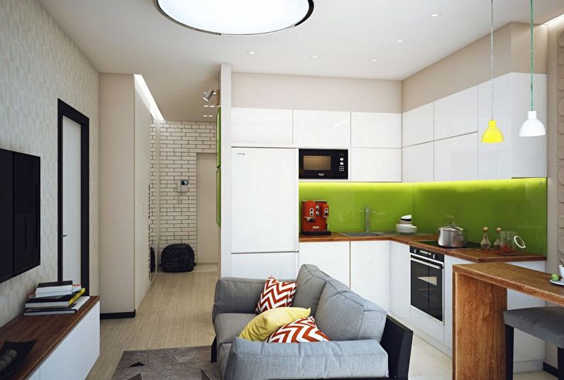 Os designers estão usando ativamente o zoneamento como a maneira mais eficaz de organizar o espaço.Para distinguir entre a sala de estar e a cozinha, geralmente é organizada uma área verde.