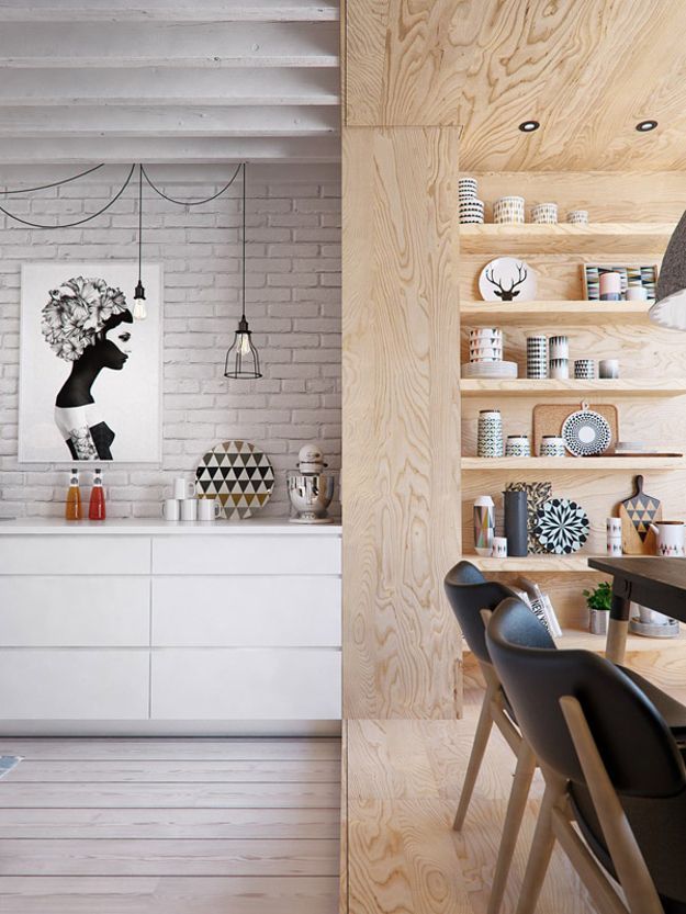 Quem prefere o minimalismo é atraído pela Escandinávia. Este design usa cores legais. Cores populares: branco, azul, cinza, marrom, leitoso, tons de amarelo. Uma abundância de luz é observada no interior. Dos materiais mais preferidos são: madeira, gesso e tijolo. Uma nota de "selvageria" no interior é muito apropriada.
