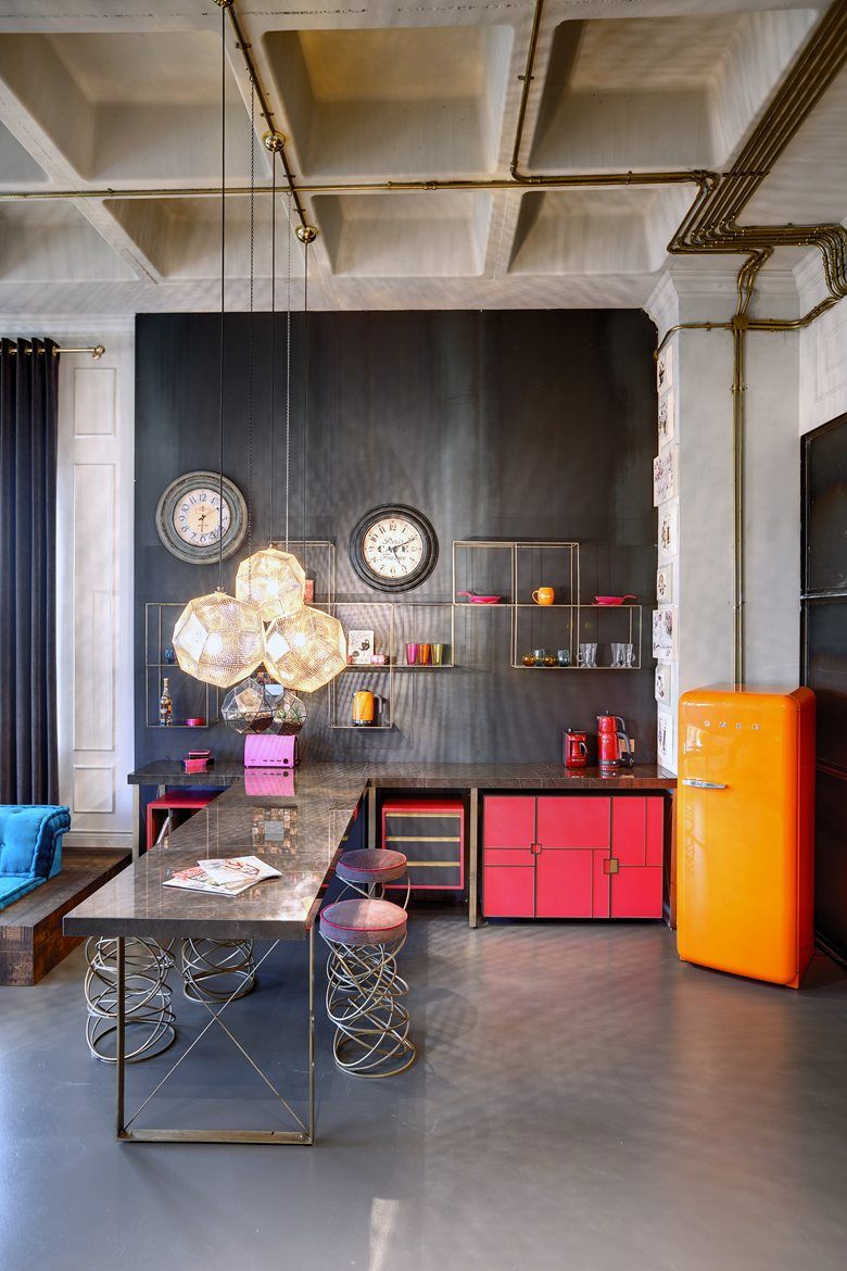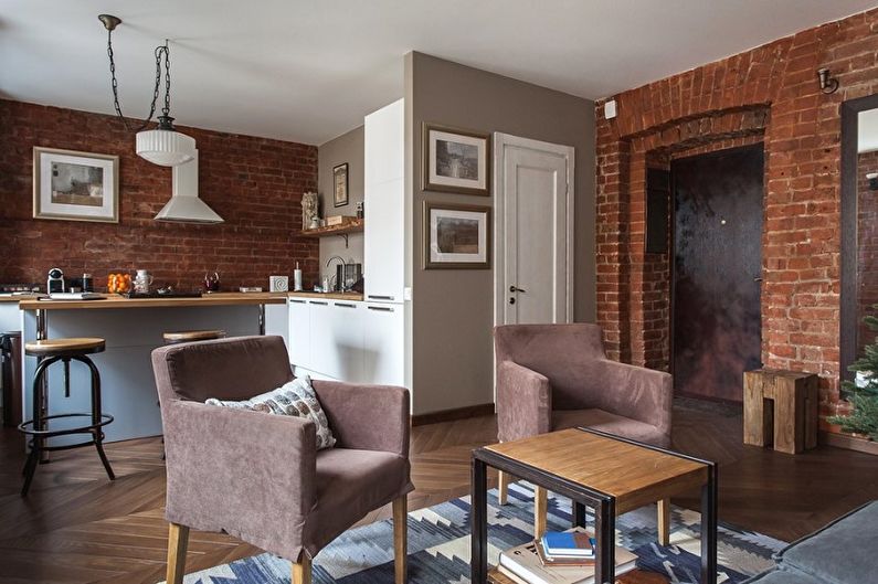 O interior, feito em estilo industrial, é conciso. Não há excessos de decoração, mas todos os elementos básicos estão disponíveis. A presença de paredes de concreto ou tijolo é característica. O piso é feito de tábuas e os móveis têm uma textura áspera. Sob a forma de elementos decorativos, vigas, tubos, metais são usados.