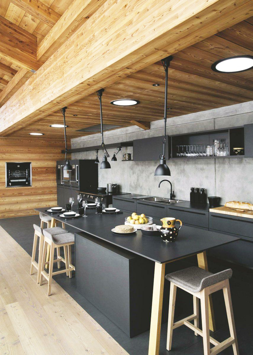 O espaço sob a estrutura da ilha servirá para a colocação de utensílios. O mezanino, localizado sob o teto, dará ainda mais funcionalidade. A tendência é um conjunto de cozinha com portas volumétricas, que podem ter uma textura brilhante ou de vidro, de preferência escura.