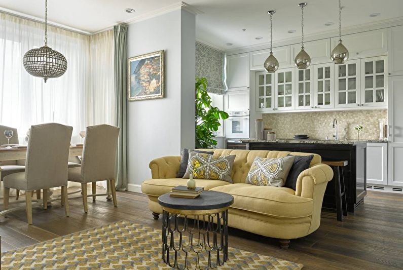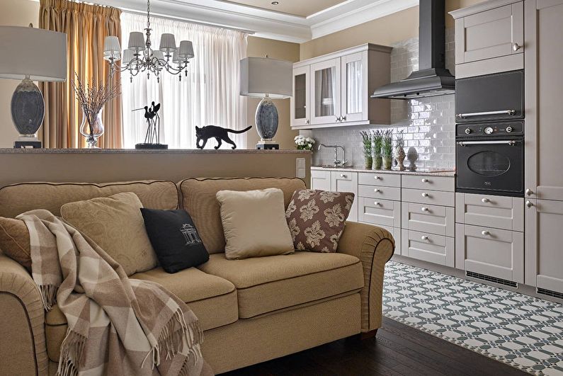 Basta colocar um sofá e uma mesa de café para criar conforto no interior da cozinha da sala. A Foto 2020 demonstra como implementar o zoneamento. Recomenda-se implantar o sofá de forma que suas costas estejam localizadas em frente ao conjunto da cozinha. Recomenda-se que estantes de livros maciças não sejam colocadas em áreas da sala - seu lugar no corredor ou na galeria.