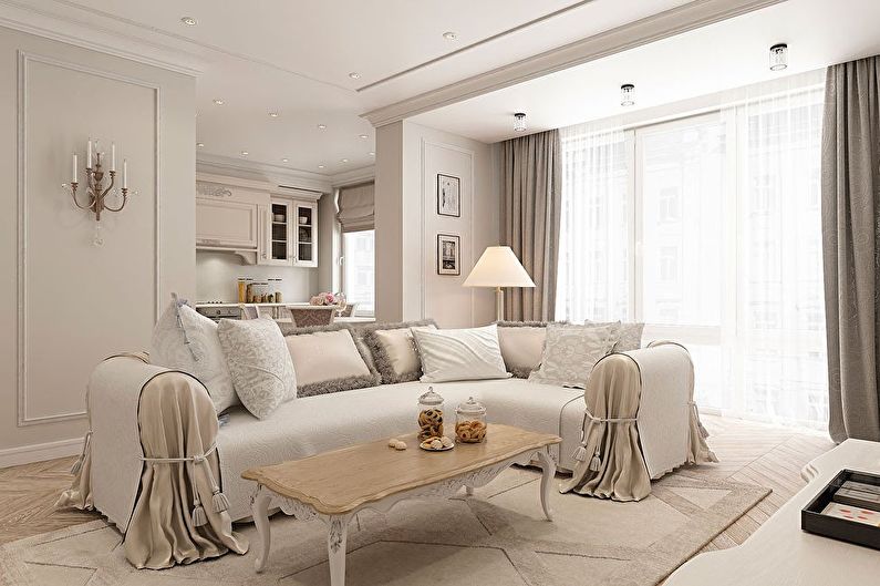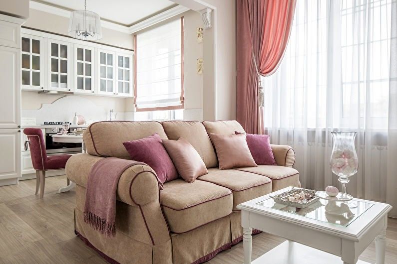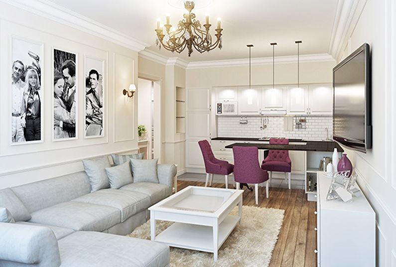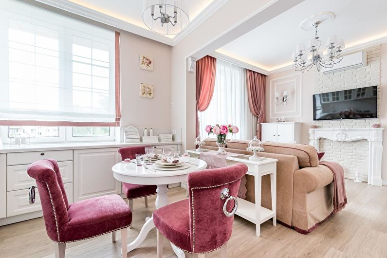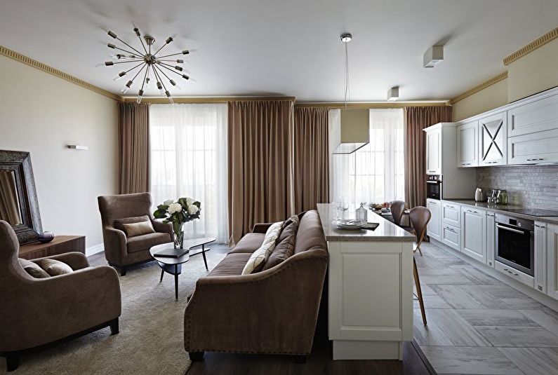 - A união do espaço. Os quartos são combinados usando um esquema de cores único e elementos de móveis relacionados. Você pode criar um único conjunto no interior usando o rack. Também para esse fim, use um balcão de barras ou divisórias deslizantes.