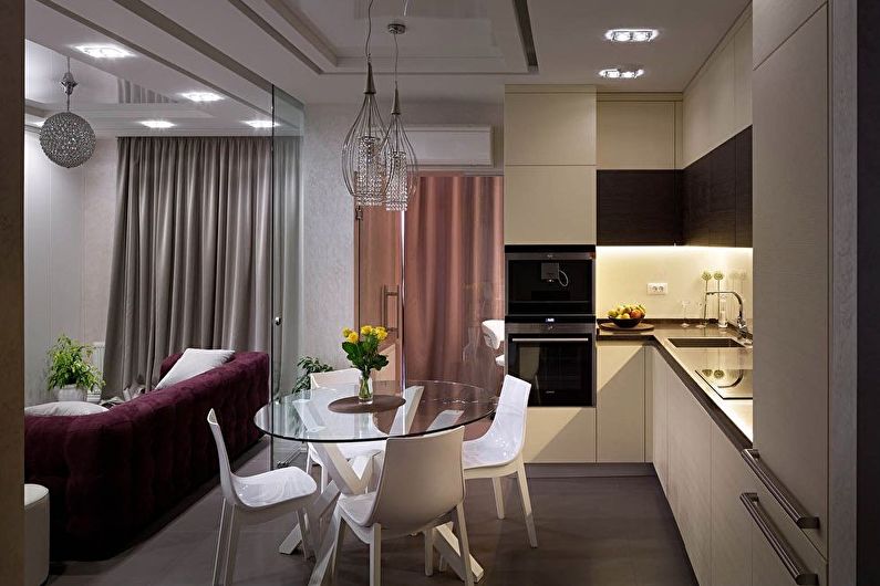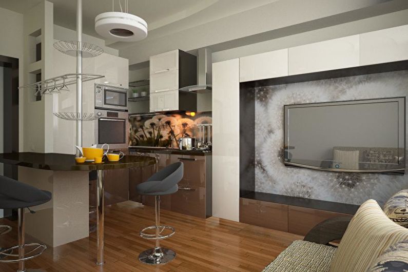 Portanto, o novo interior da cozinha da sala é ergonômico, mas ao mesmo tempo funcional. Recomenda-se rejeitar a monotonia no interior e recorrer à individualidade.