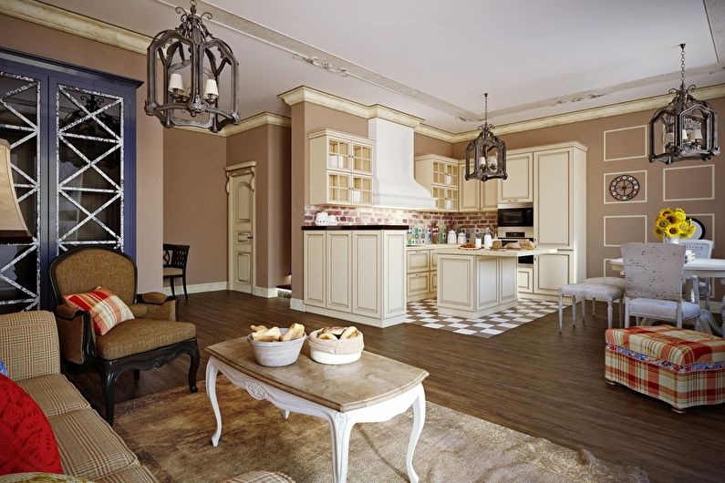 Esse estilo é caracterizado por provadores do chão ao teto. Seções de tamanhos diferentes permitem equipar locais para guardar coisas. Os móveis são estofados em tecidos naturais, acessíveis. Cores preferidas: branco, amarelo, marrom, verde, azul. Como acabamento, é usado verniz ou tinta leve. A abundância de têxteis naturais dá uma sensação de calor.
