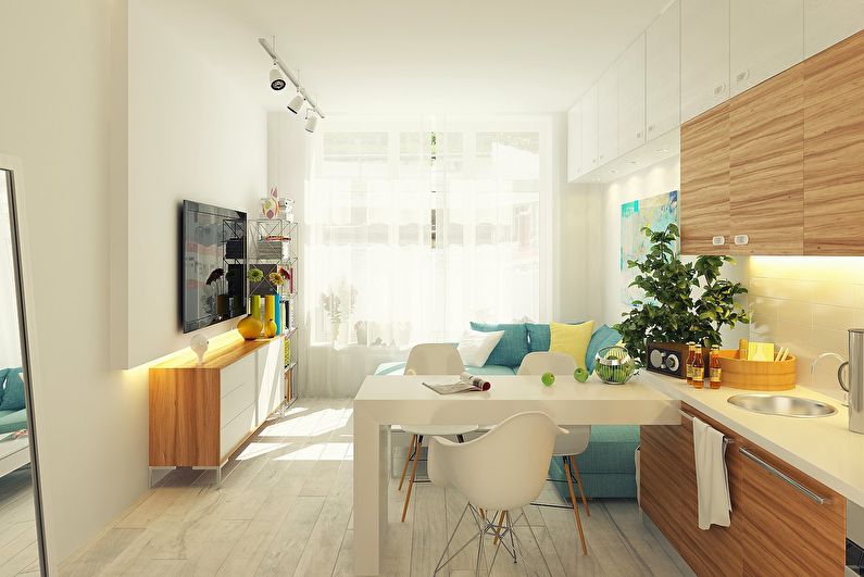A partir de móveis, é necessário excluir o uso conjunto de móveis e sistemas de armazenamento de cozinha. É preferível o mobiliário embutido, que oferece mais espaço, além de projetos com portas de correr.