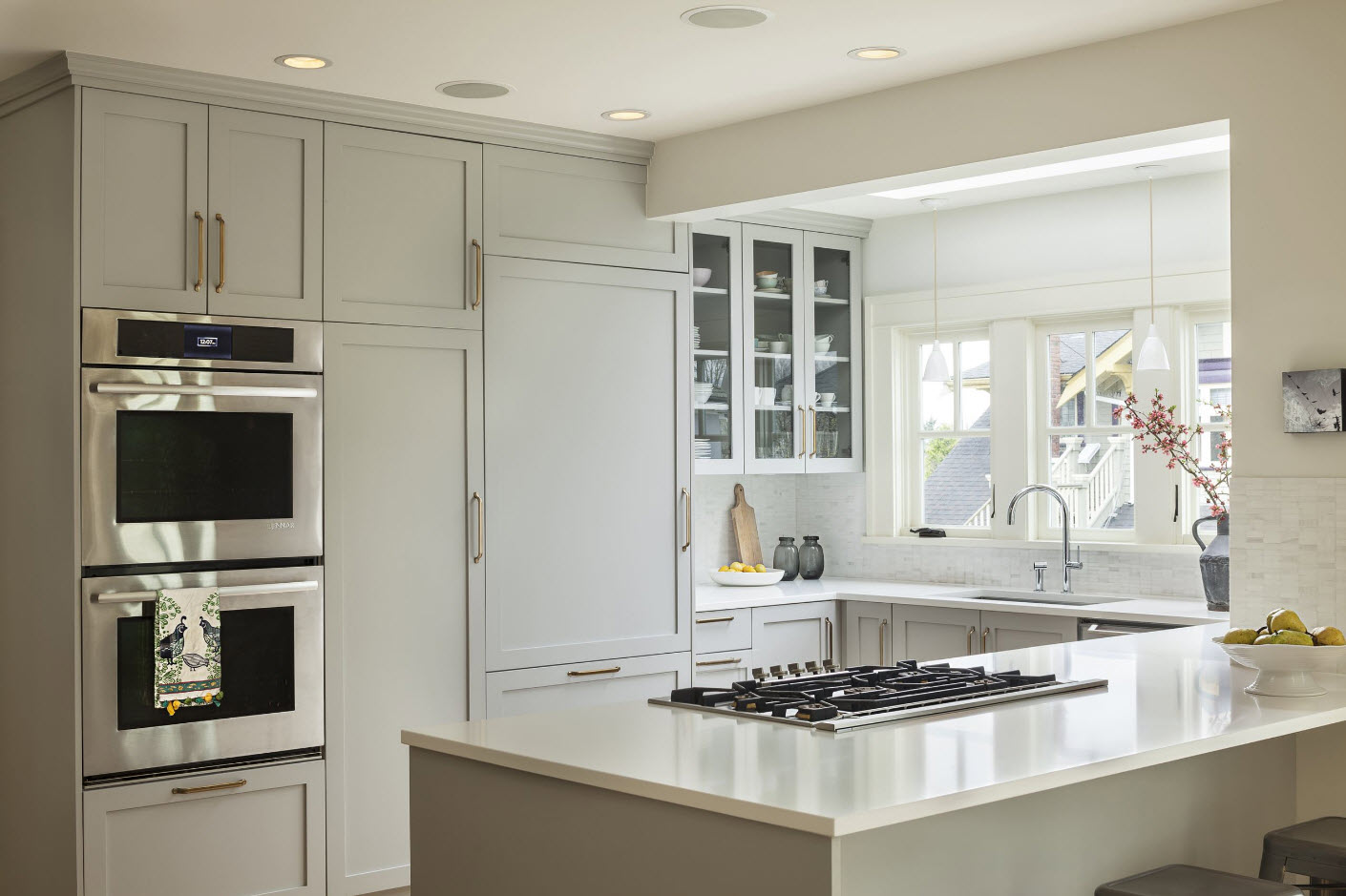 Para criar aconchego no interior cinza da cozinha, é melhor usar materiais naturais para móveis - madeira para o corpo dos fones de ouvido e cadeiras, vidro e pedra para as bancadas, metal para a moldura.