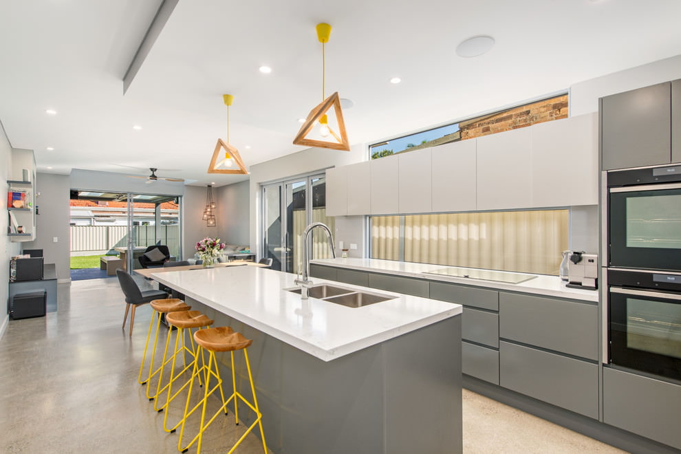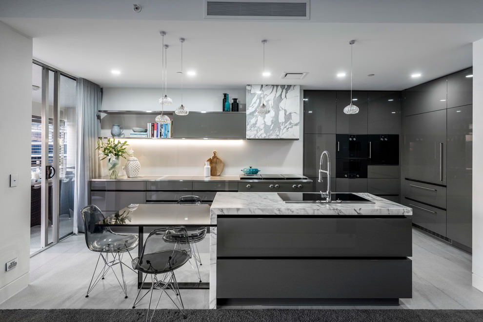 As superfícies brilhantes do conjunto de cozinha para especialistas em cozinha cinza sugerem famílias jovens, e a cozinha cinza fosca é adequada para as gerações mais velhas.