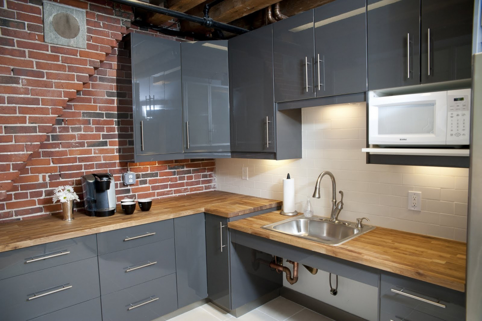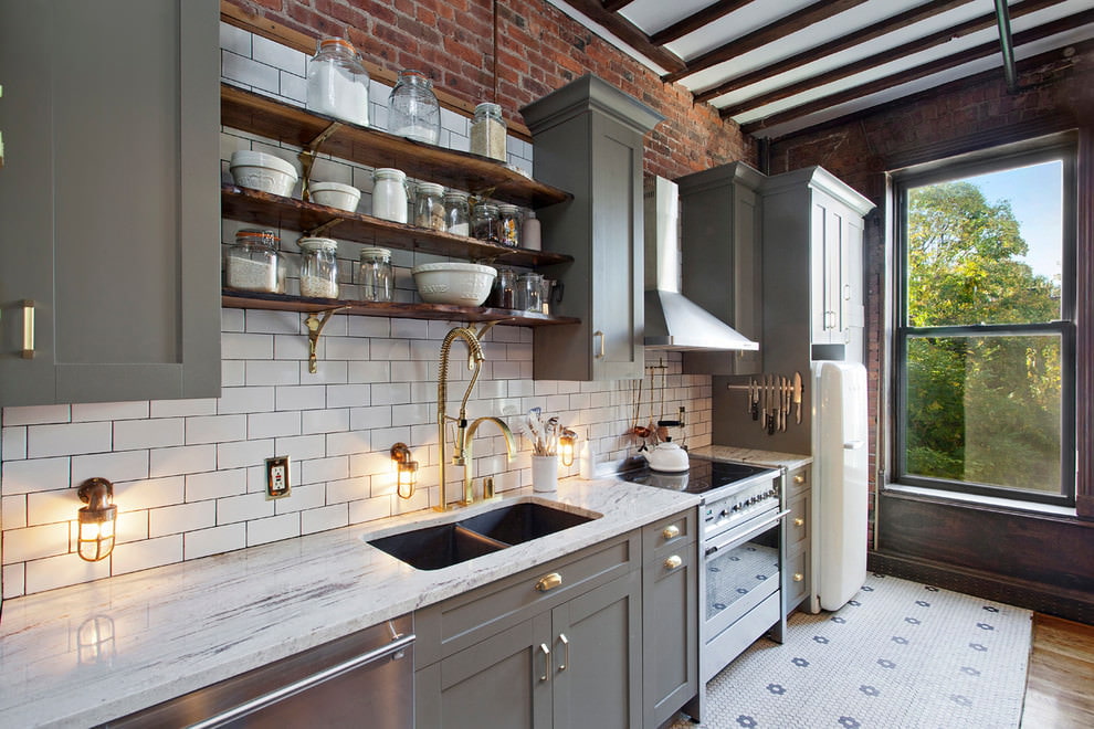 A cor cinza é a mais adequada para misturar estilo antigo e moderno. Existem muitos materiais naturais no loft, como madeira, metal e tijolo. Use cinza em tons claros e frios. Eles não irritam os olhos e reconciliam os diferentes gostos dos membros da família com sua paz de espírito. E o cinza também permite combinar dois estilos ao mesmo tempo no interior da cozinha - loft e minimalismo.