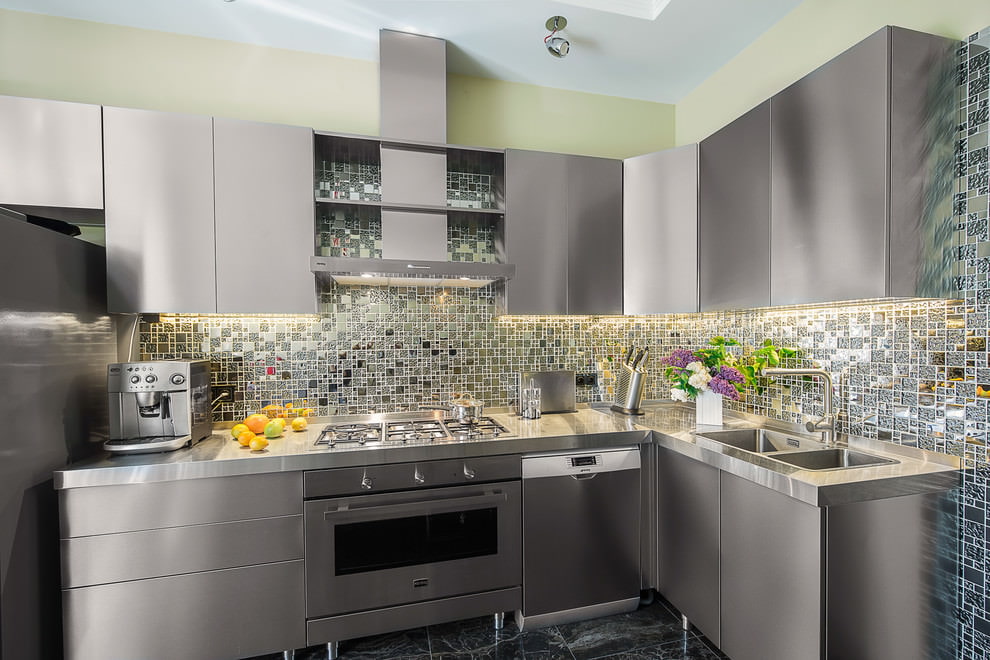 De acordo com o design, as paredes e o piso da cozinha cinza são finalizados com materiais resistentes à umidade e facilmente laváveis.