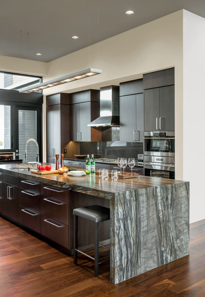 - Acabamento em pedra. A pedra decorativa de mármore é amplamente utilizada para cozinhas cinza. Este design é renovado, confere à cozinha uma nota natural.