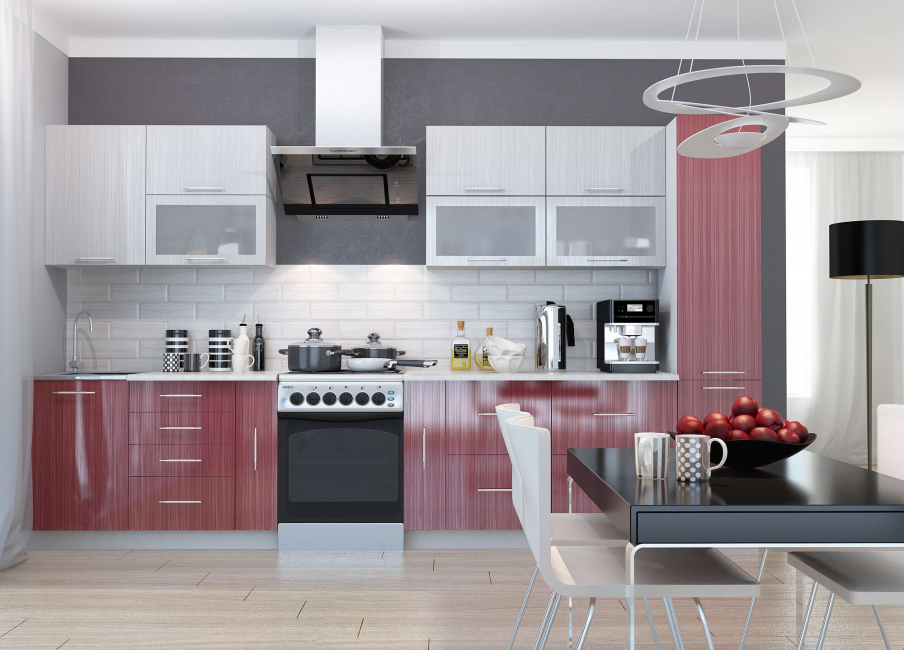 - Cinza com vermelho. Projetado para naturezas corajosas e apaixonadas. Nesse caso, a perda de peso não deve ser incluída nos planos dos proprietários da cozinha.Não é de admirar que em restaurantes e outros estabelecimentos de restauração essa cor emocionante seja encontrada com tanta frequência.