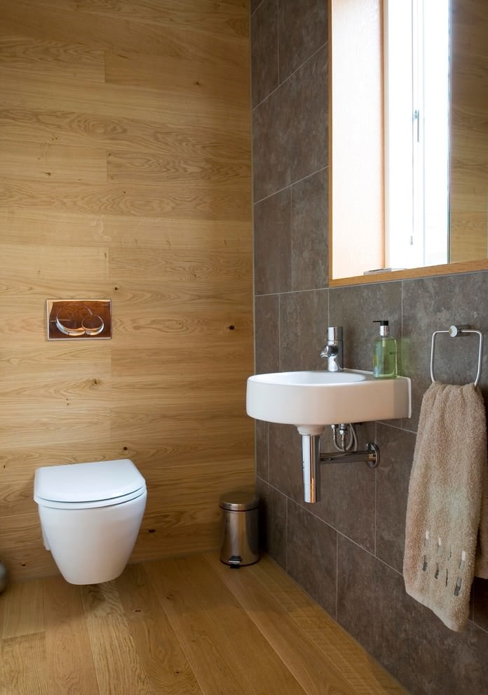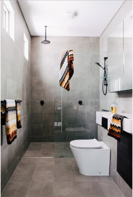 Em um banheiro pequeno, é desejável usar ladrilhos grandes, pequenos aqui podem parecer desconfortáveis