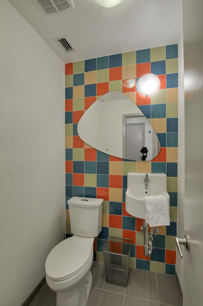 - Caleidoscópio Em outras palavras, bagunça criativa. Azulejos de várias cores são dispostos de maneira caótica. Tais interiores carregam com energia positiva e criam um bom humor.