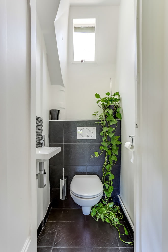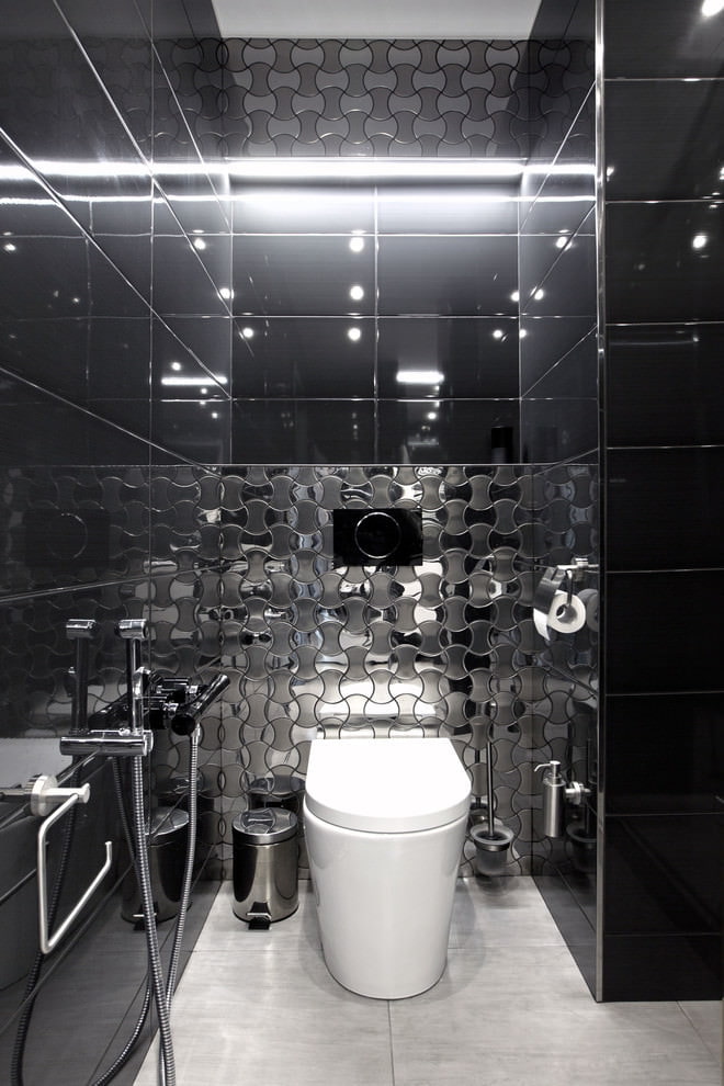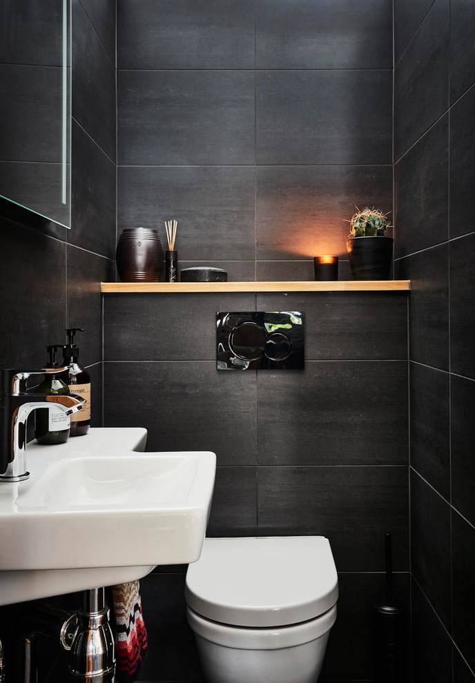 Interior orgânico de um banheiro compacto com louças sanitárias brancas como a neve e azulejos decorativos pretos