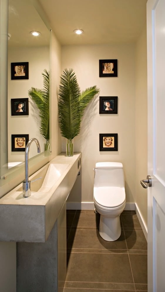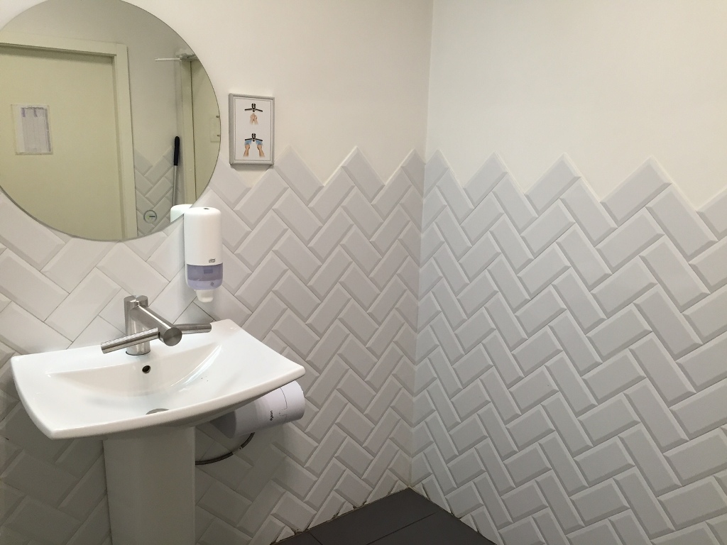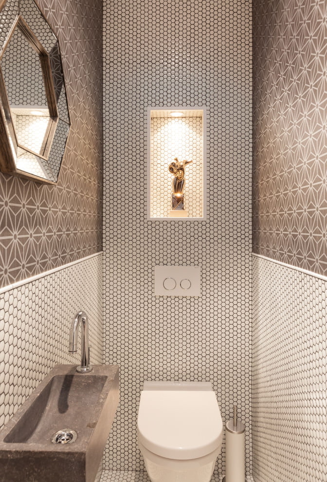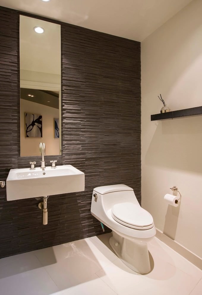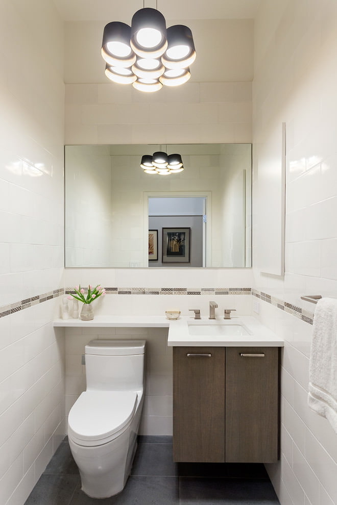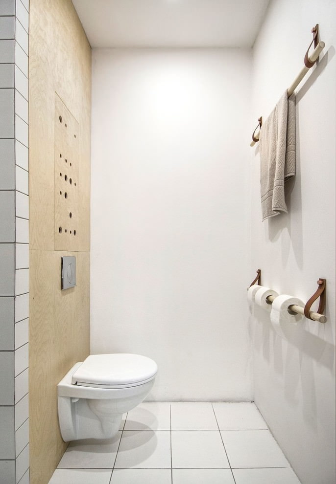 Se você colocar um ladrilho retangular ao longo de uma parede curta no chão de um banheiro estreito, poderá obter uma expansão visual da sala