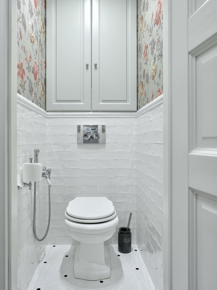 O azulejo branco torna o banheiro pequeno mais leve e mais espaçoso, razão pela qual é mais frequentemente encontrado