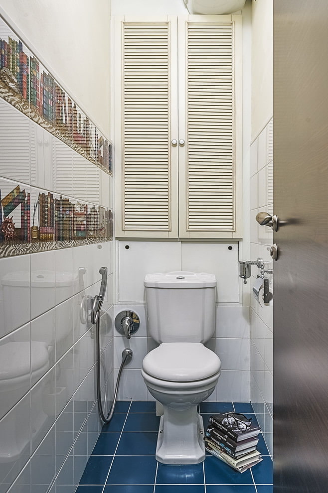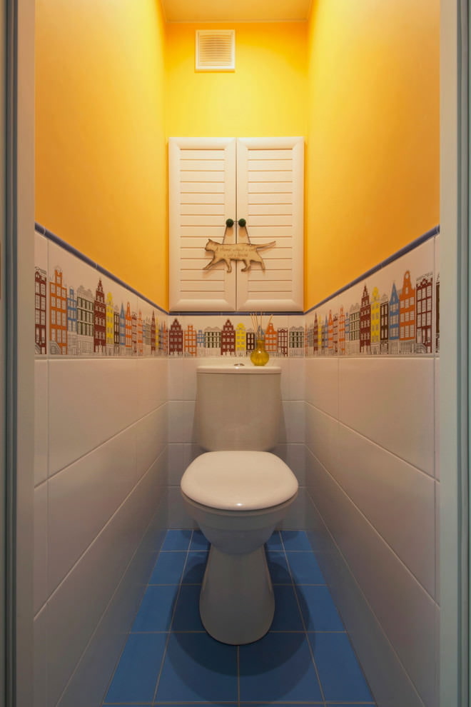 Se o banheiro tiver um teto baixo, é melhor comprar um ladrilho retangular e colocá-lo na vertical