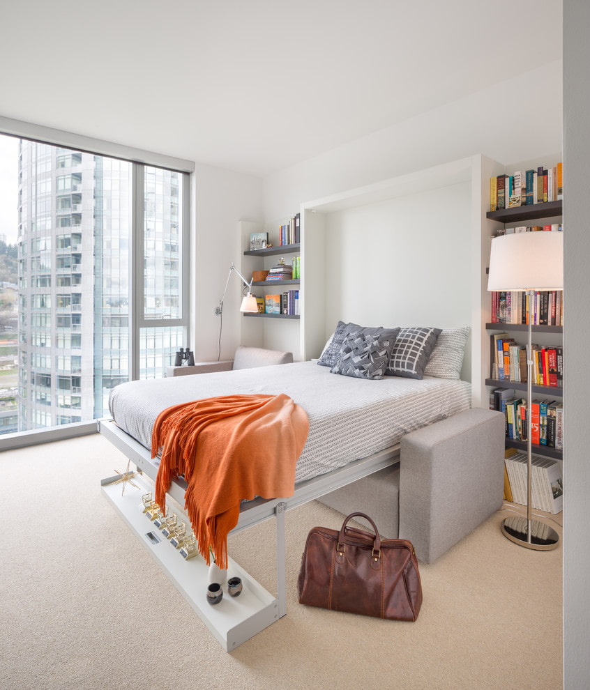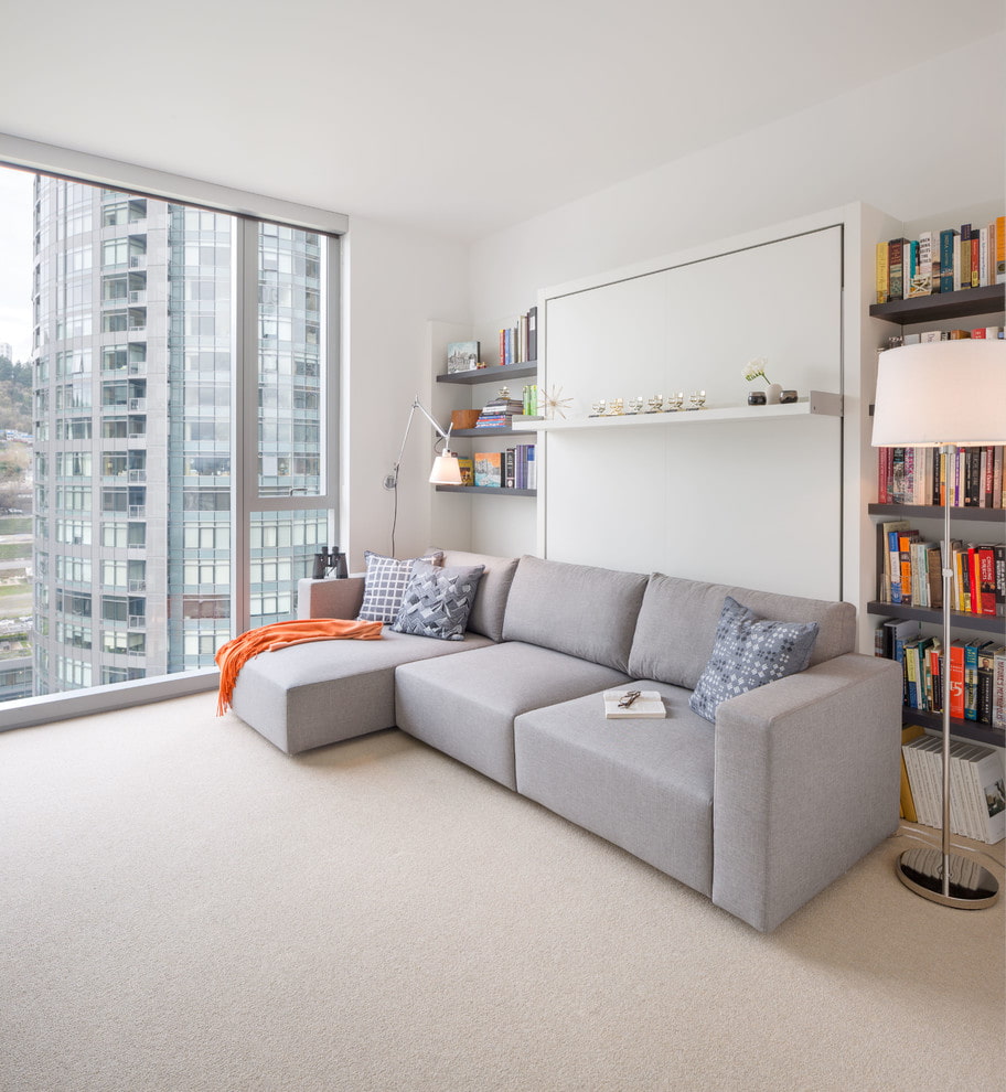 - Într-o cameră cu puține dulapuri, puteți cumpăra o canapea cu un raft de cărți și să economisiți spațiu.