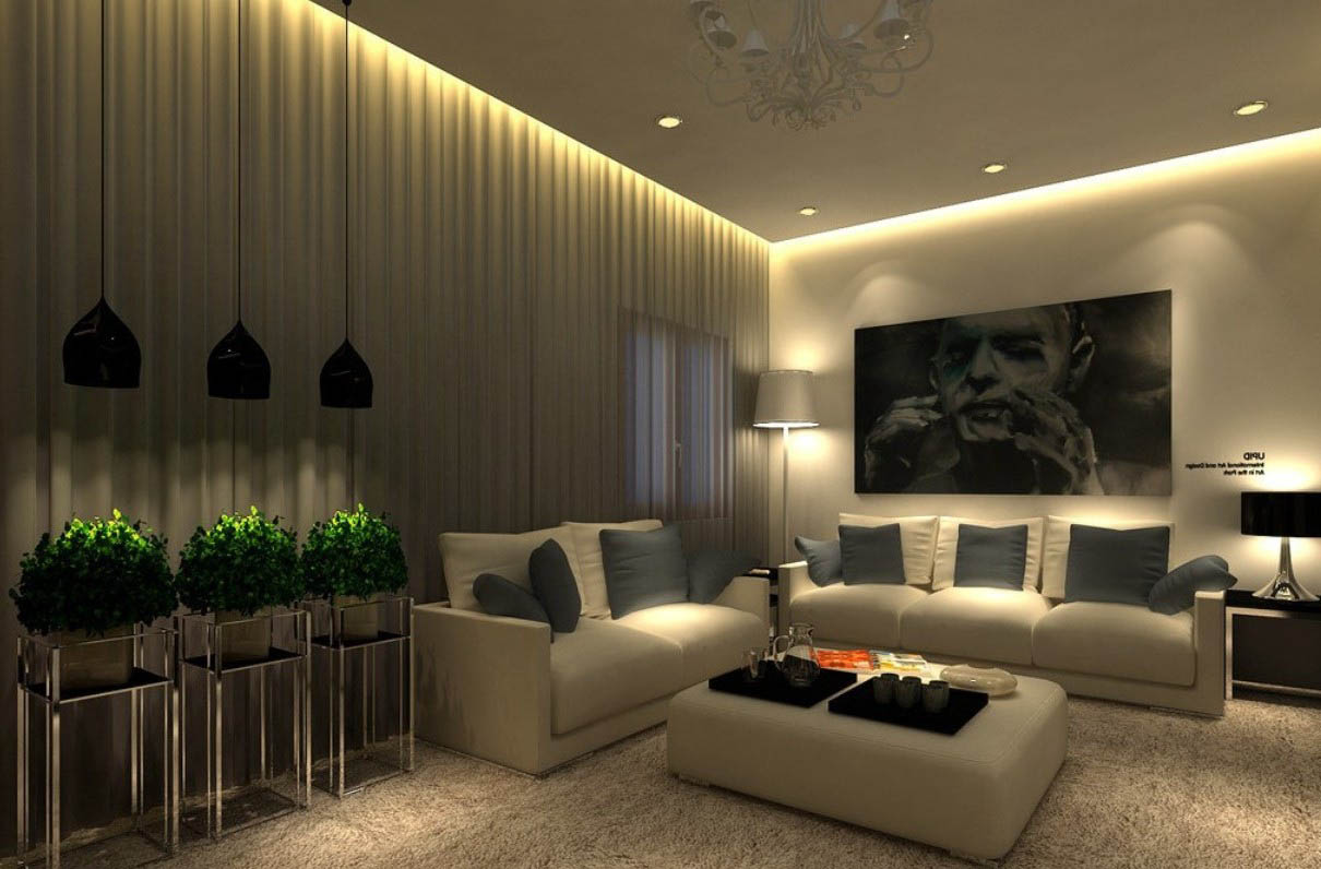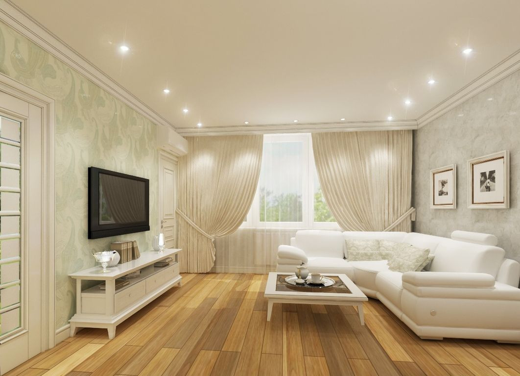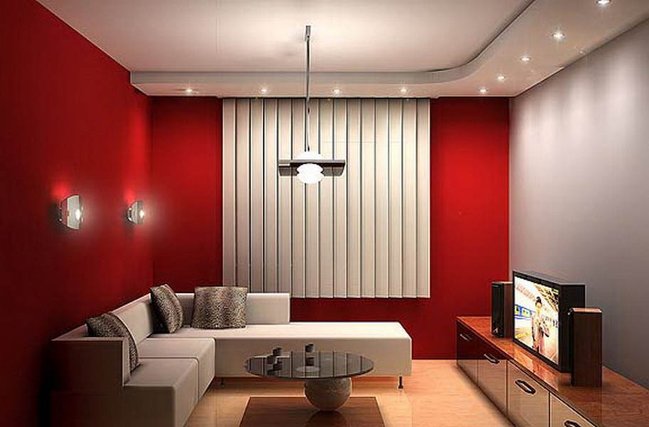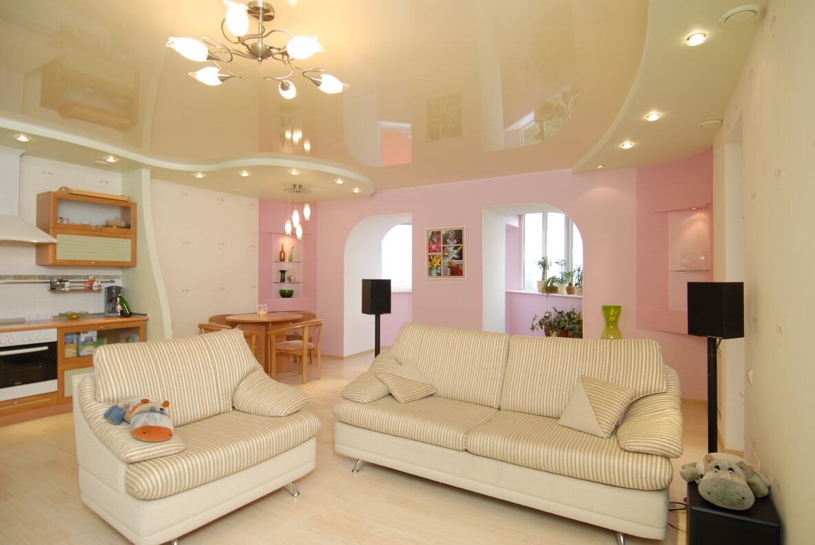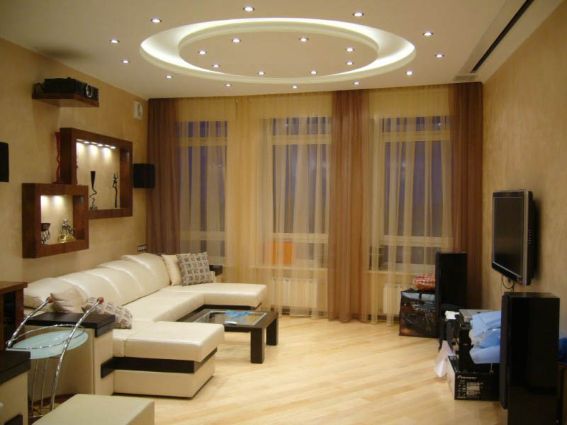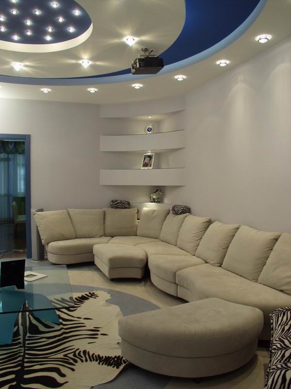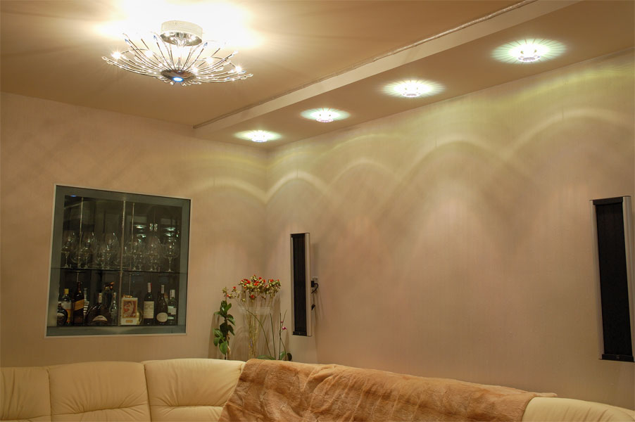 Living - aceasta este o astfel de cameră în care locația lămpilor poate fi folosită într-o varietate de moduri. Cu toate acestea, meșterii experimentați recomandă așezarea lămpilor mici în jurul întregului perimetru al tavanului, folosind în același timp sursa principală de lumină - un candelabru în partea centrală.