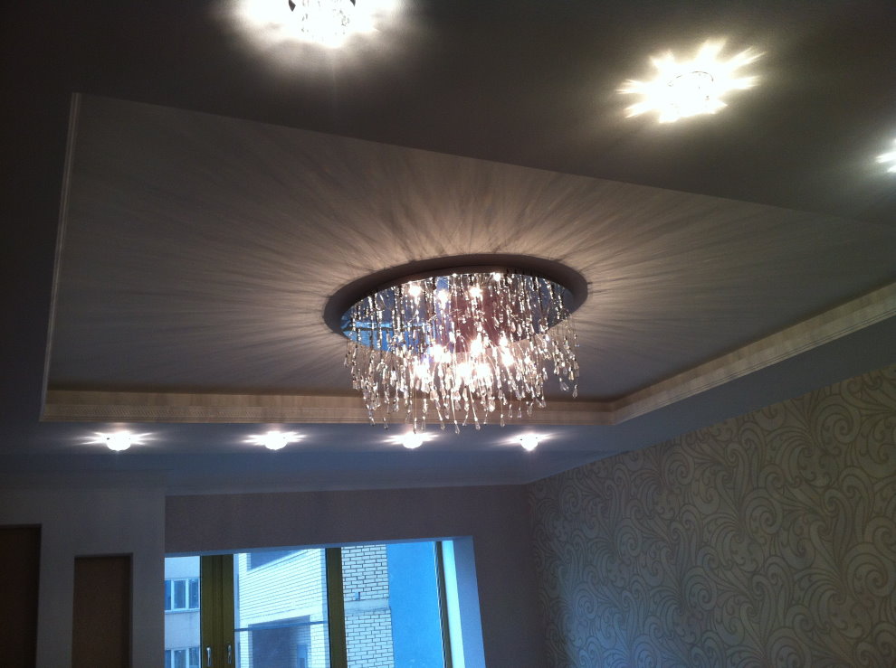 Dacă nu aveți opțiunile și cerințele speciale pentru amplasarea luminii în jurul perimetrului plafonului, atunci o opțiune excelentă ar fi un candelabru în centru și lumina reflectoarelor într-un semicerc pe ambele părți.