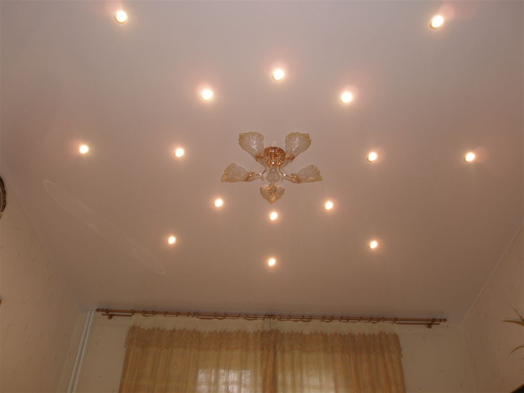 - Exemple foto despre locația becurilor și a corpurilor de fixare pe un tavan întinzător în sală