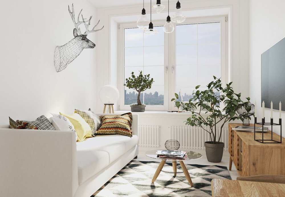 Culoarea albă este folositoare. Acesta este fundalul perfect pentru aproape dublul spațiului vizual. Pentru a adăuga varietate, îl diluăm cu mai multe nuanțe. De exemplu, pentru o canapea mare alegem o culoare neutră și facem perne luminoase, decoram pereții cu tablouri color și căutăm mese de cafea în forme bizare.