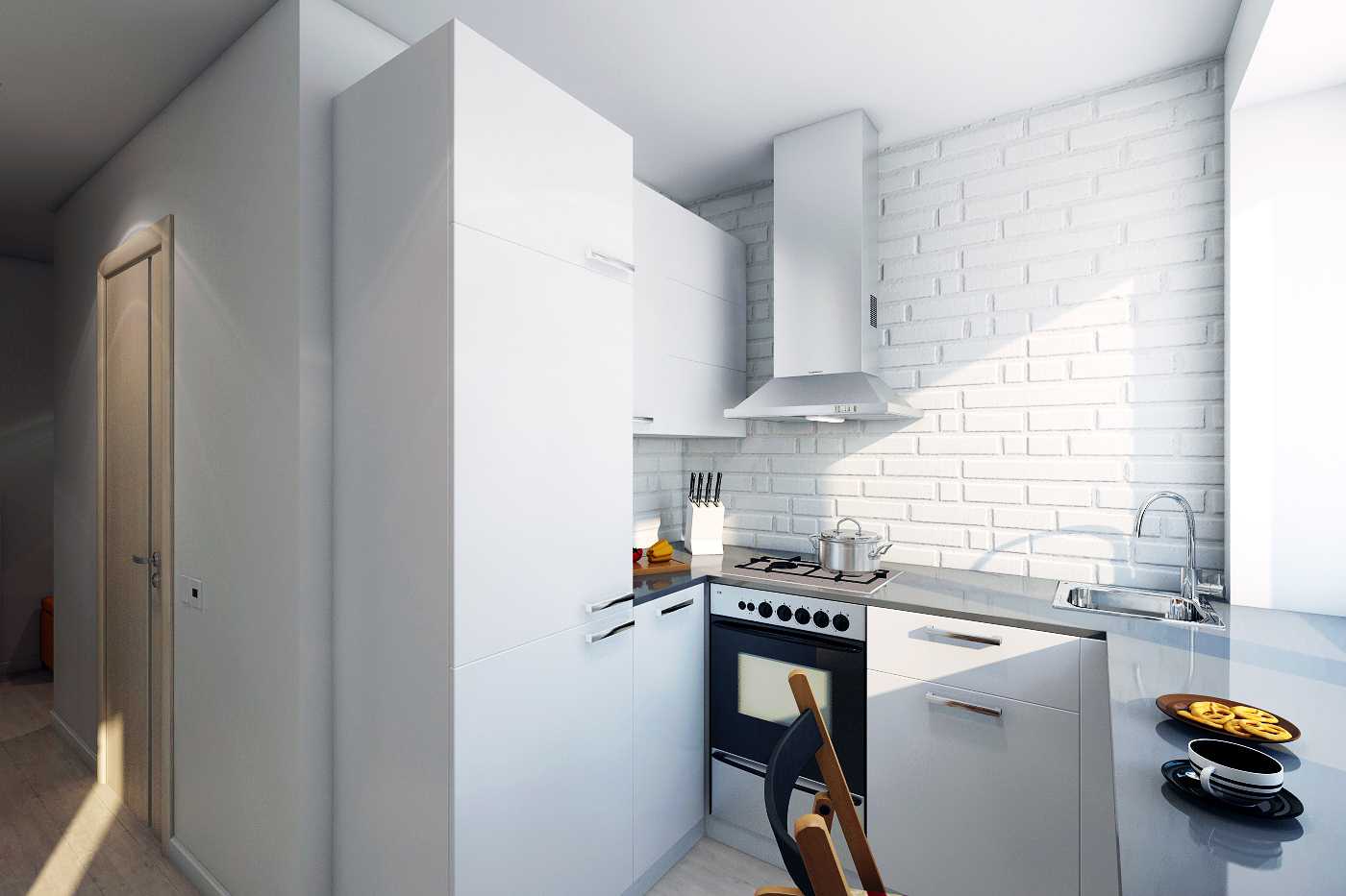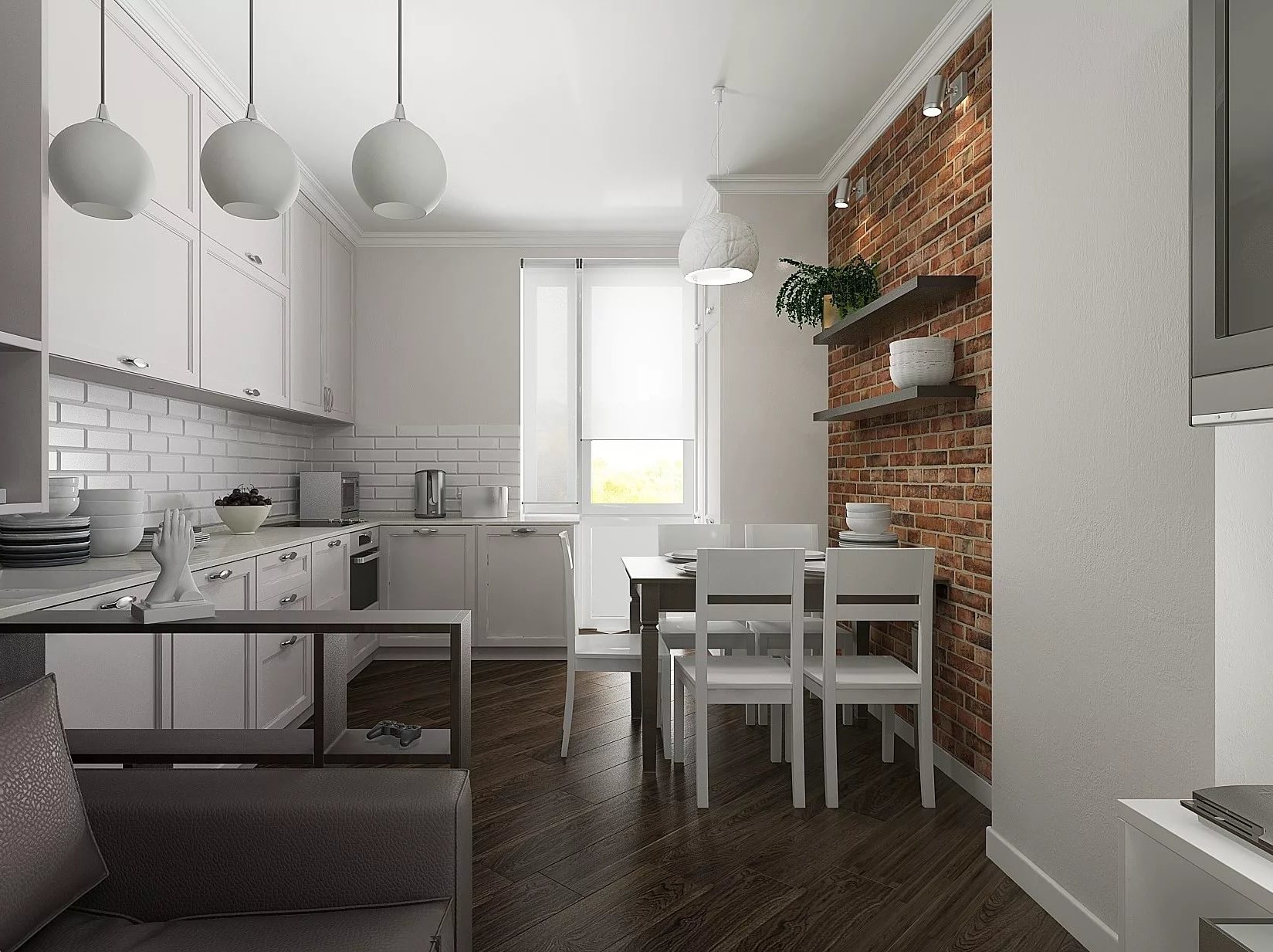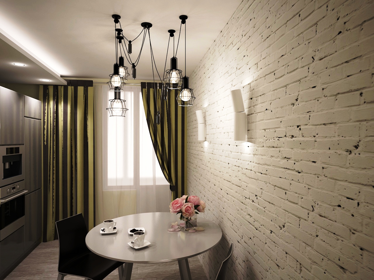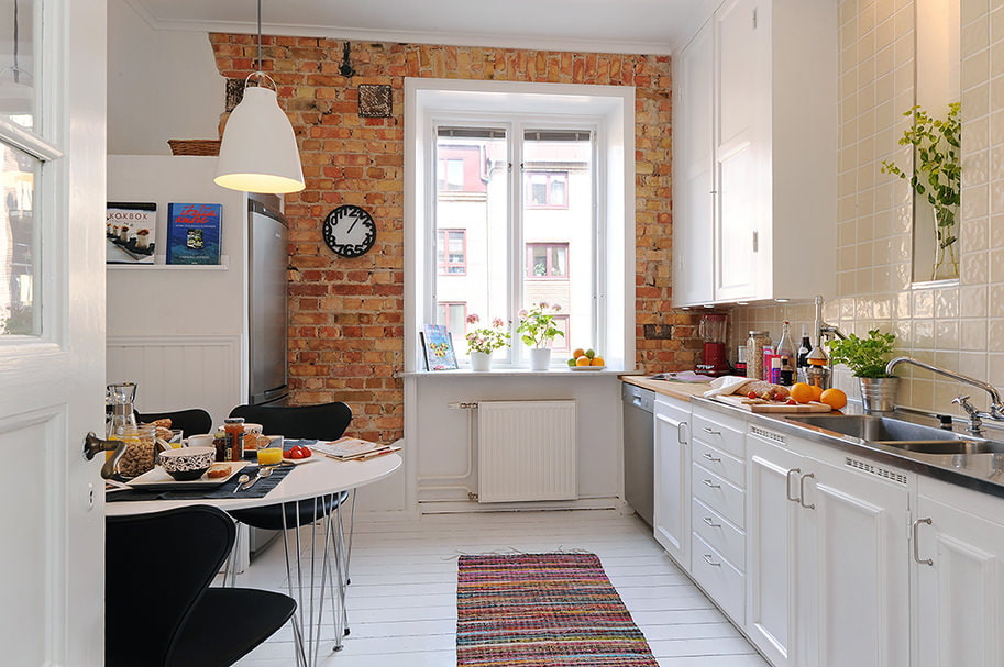 Bucătăriile mici nu sunt recomandate să fie acoperite complet cu cărămidă, astfel încât interiorul „subsolului” să nu fie obținut. Este suficient să evidențiezi un perete de accent