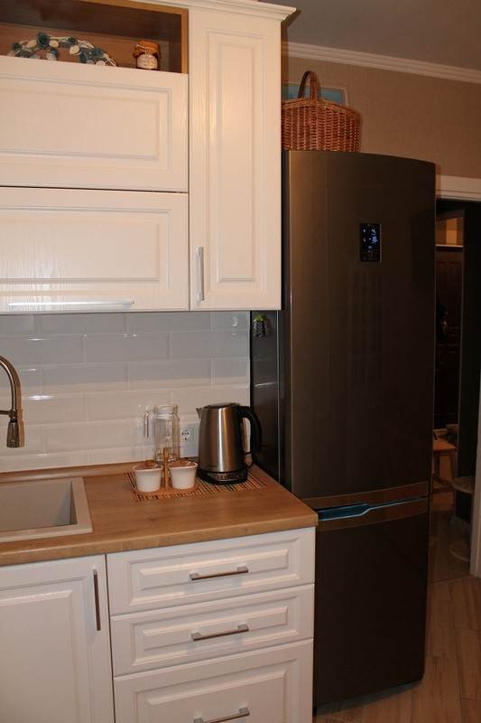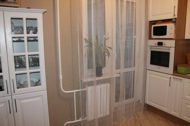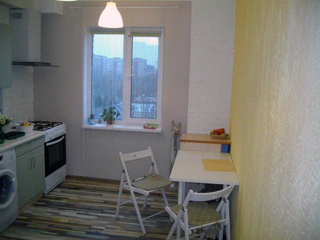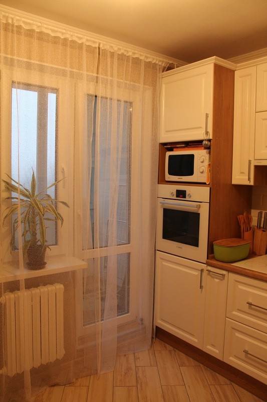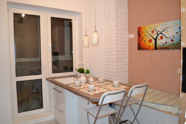 - Dezvoltarea este o altă soluție de succes. Prezența unei loggii va oferi spațiu suplimentar. Scoateți toate inutile din bucătărie.
