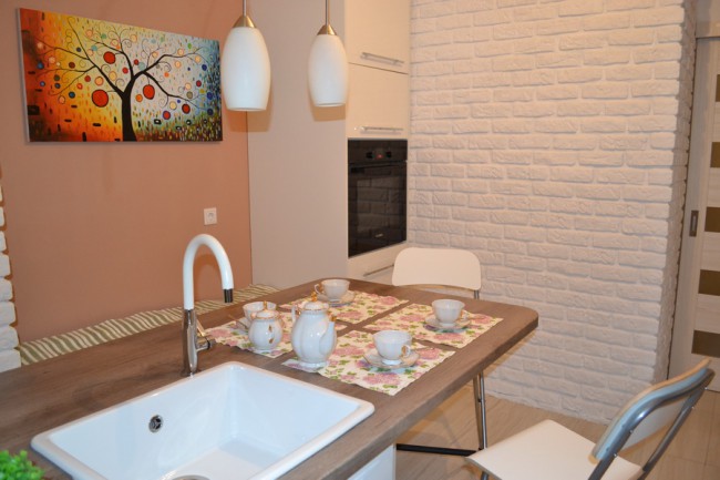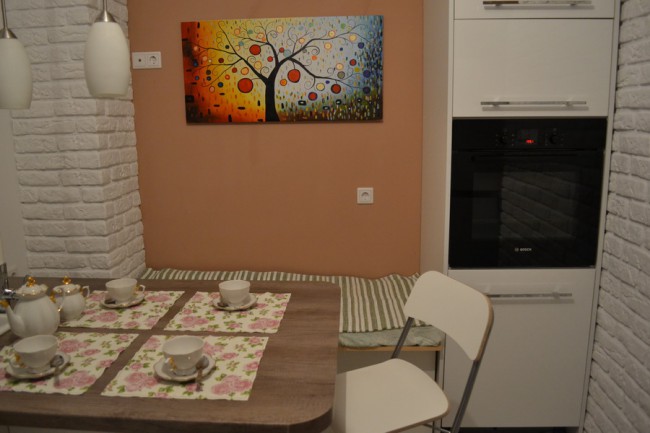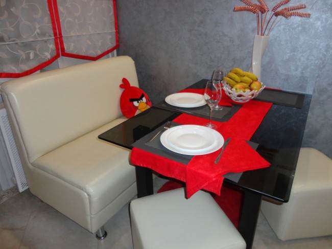 În funcție de numărul membrilor familiei, este organizată o zonă de masă. Pentru două persoane, este suficient un raft mic și scaune moi. Bucătăria mică este compensată de forma blaturilor (rotunde sau semicirculare).