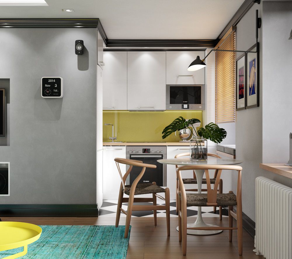 Important! Mutarea zonei de luat masa în sufragerie face posibilă plasarea unui contor de baruri compacte în bucătărie.
