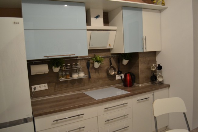 - Liniar. Principiul este amplasarea căștii de-a lungul unui perete. Cu un număr mare de dispozitive tehnice și elemente de mobilier, opțiunea nu este cea mai potrivită. Compactitatea este necesară aici. Pe de altă parte, spațiul este disponibil pentru o zonă de luat masa spațioasă. Dacă există un balcon din bucătărie, folosim o dispunere liniară paralelă.