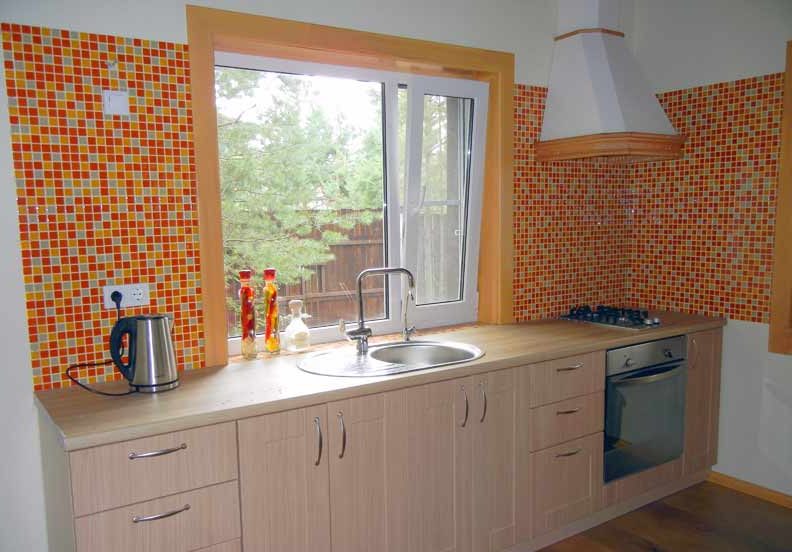 - Țară. Materialul omniprezent este lemnul. Se folosește pentru decorarea și decorarea pereților și pardoselilor, în timp ce se execută șlefuirea și prelucrarea brută a materialului. Un element suplimentar al decorului poate fi borcanele mici cu gem preparate, așezate pe rafturile deschise.