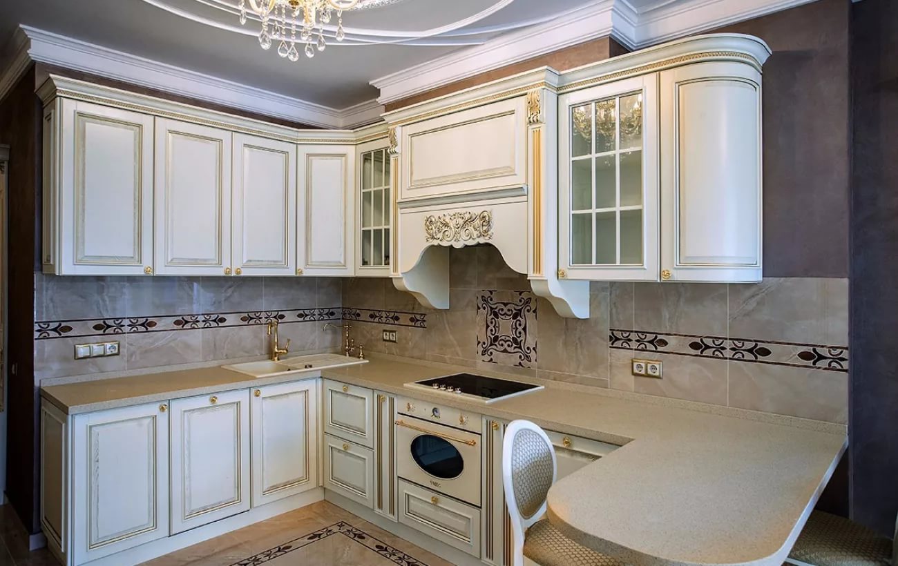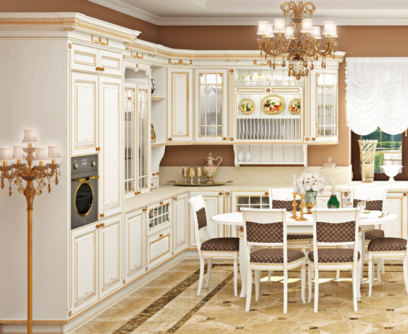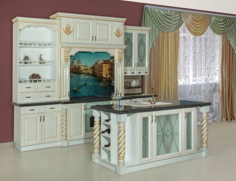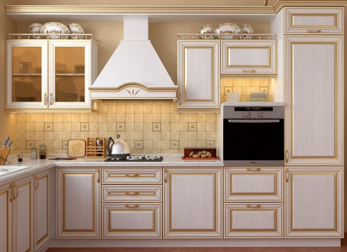 O astfel de bucătărie luminoasă clasică este combinată cu o patină de orice culoare. Tandrețea va da culori gri, albastru, verde deschis, auriu, liliac.