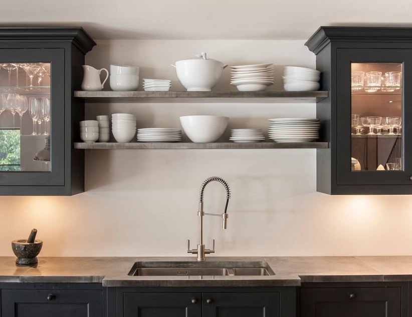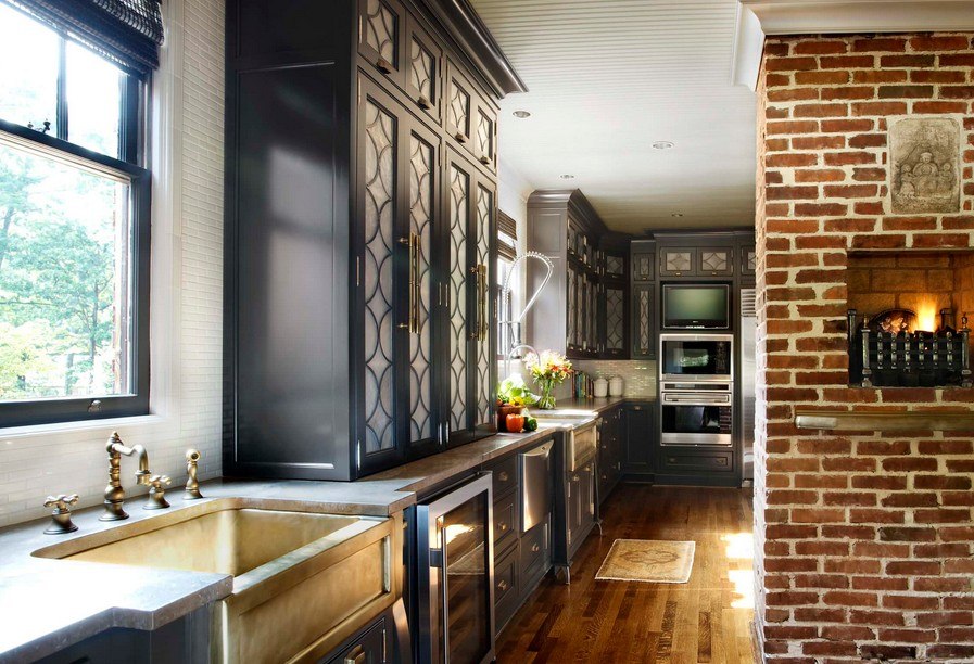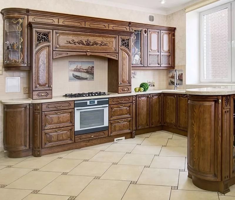 Pentru bucătăriile clasice, cel mai bine este să comandați dulapuri cu o înălțime de până la tavan. Pot fi completate cu elemente de fațadă din zăbrele sau din sticlă.