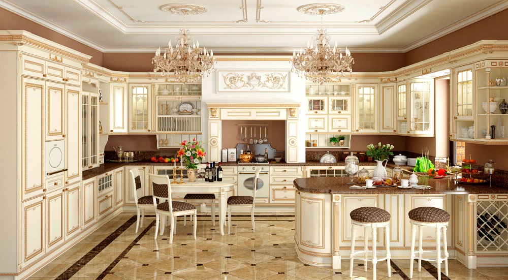 Această opțiune este potrivită pentru proprietarii de bucătării mari și spațioase. De asemenea, ei trebuie să fie plini de lumină. În acest caz, patinarea se realizează cel mai bine cu ajutorul unor astfel de nuanțe: auriu, argintiu, alb.