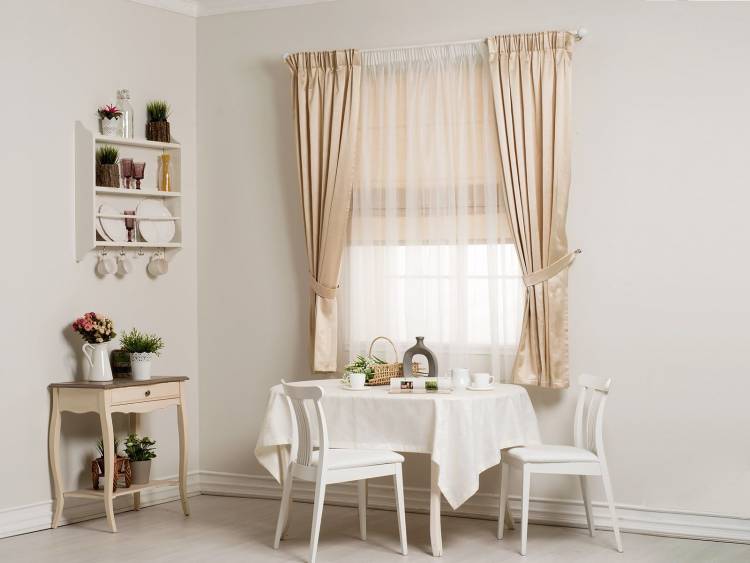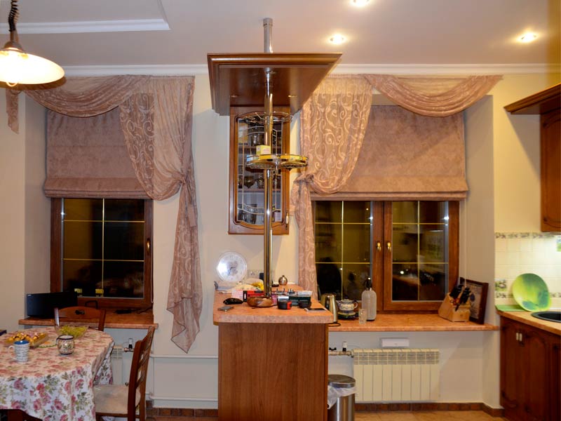 O perdea îngrijită cu pliuri în bucătărie într-un stil clasic