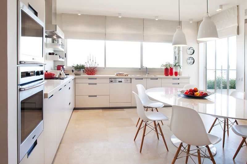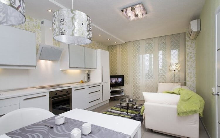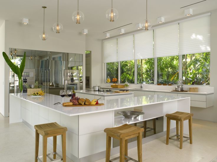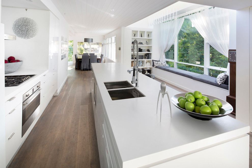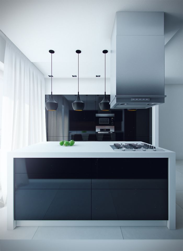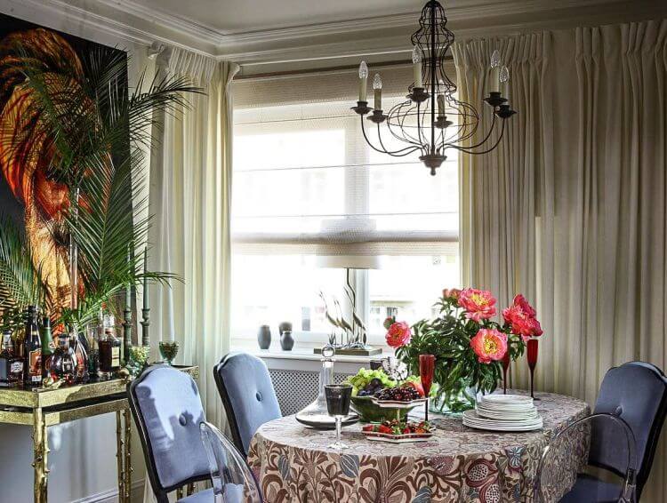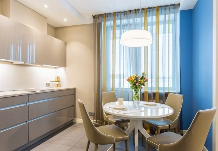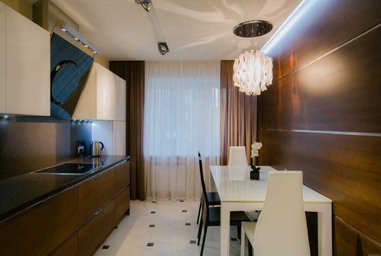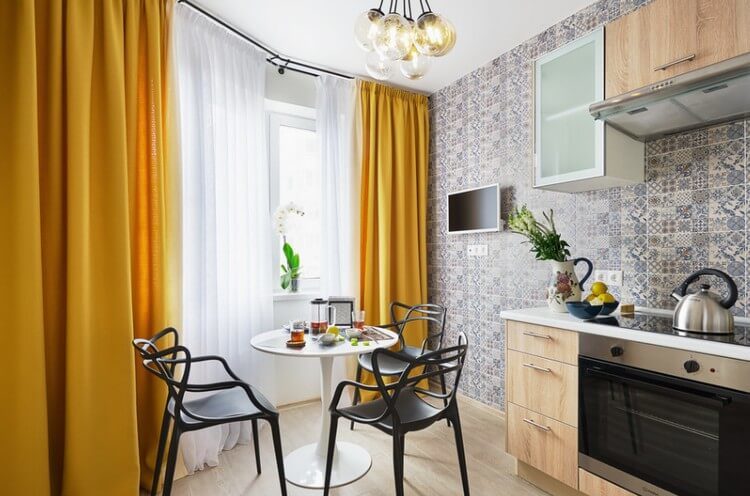 Perdelele lungi sunt adesea folosite pentru a proiecta o bucătărie în stil modern.