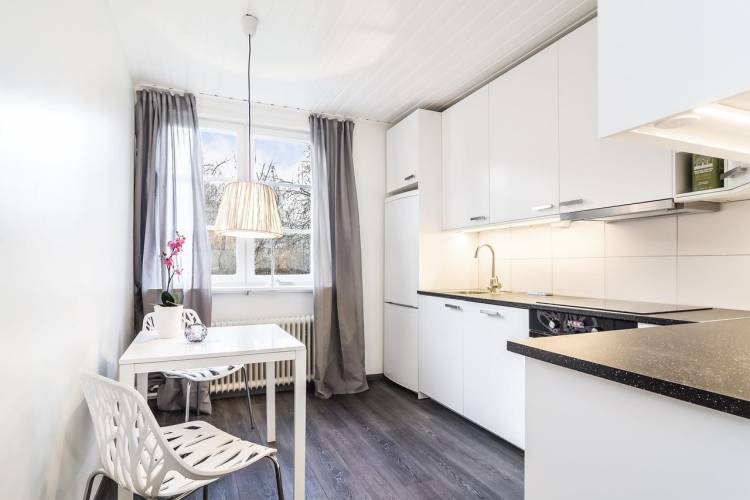 Perdelele gri din material gros sunt perfecte pentru interiorul bucătăriei în alb