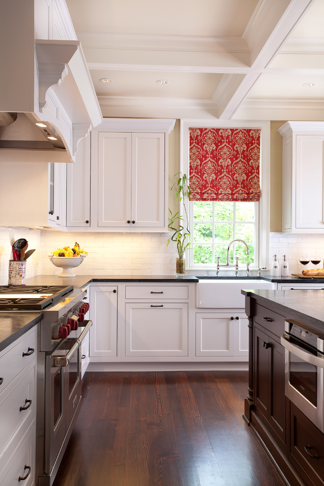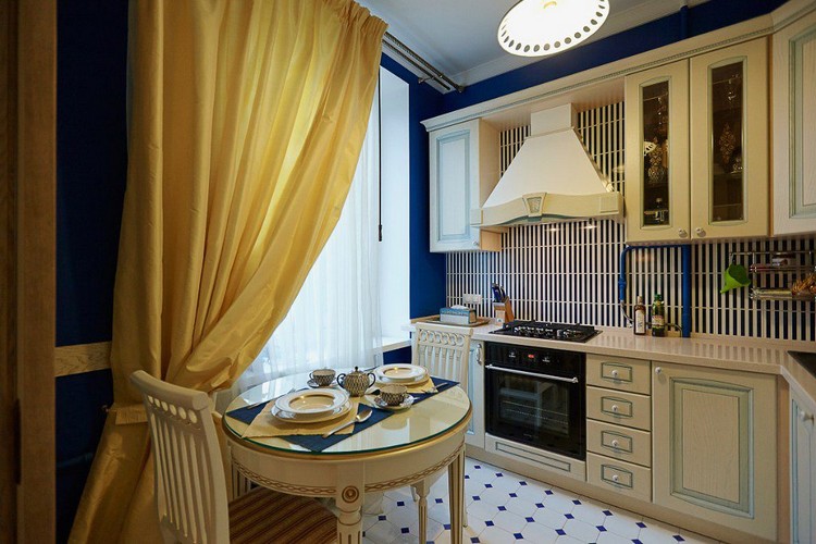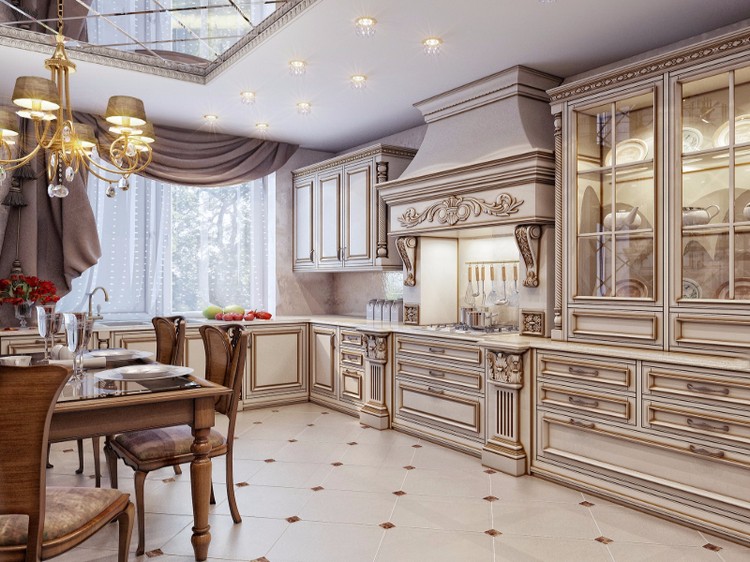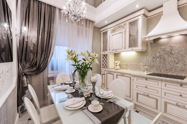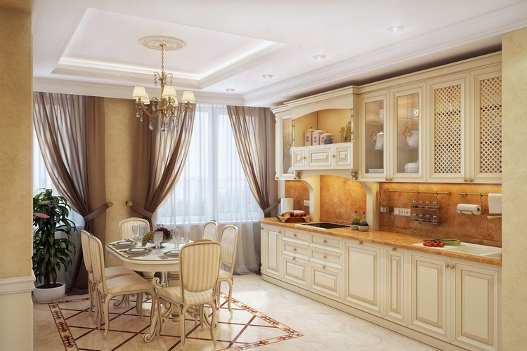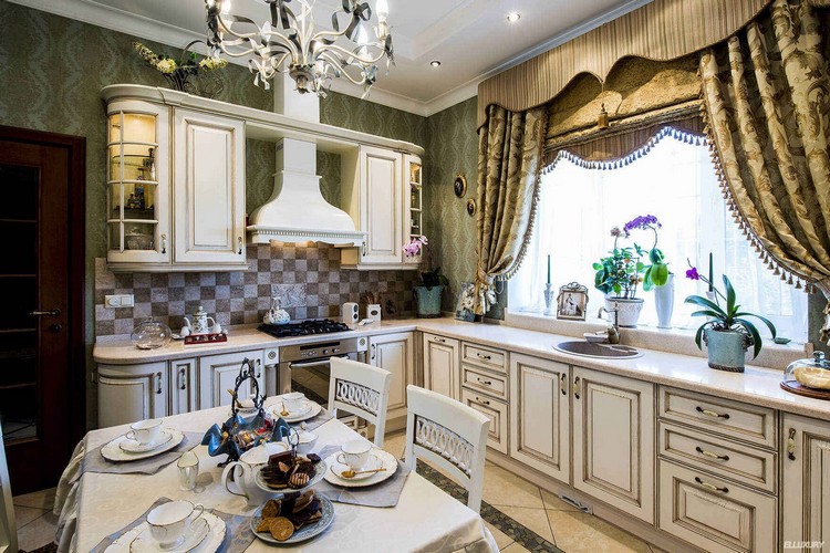 Perdele decupate la podea într-o bucătărie în stil clasic