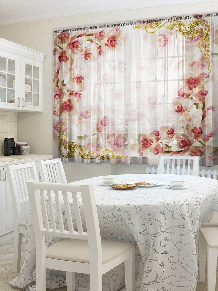 Interiorul bucătăriei poate fi armonios doar într-o singură condiție - când toate elementele decorului și decorului se îmbină bine între ele. Perdelele trebuie alese ținând cont de direcția de stil în care este decorată bucătăria. Dacă alegeți un interior clasic, ar trebui să acordați atenție modelelor lungi și medii de tul translucid. Un astfel de tul poate fi atașat la cornișă pe inele de metal frumoase. Acest lucru va adăuga o notă specială compoziției.