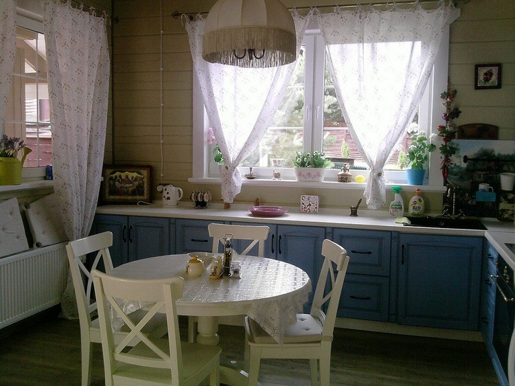 În stilul Provence, este mai bine să cumpărați perdele ușoare cu un imprimeu floral. Perdelele încadrează foarte ușor deschiderea ferestrei, la locul de colectare pot fi decorate cu panglici din satin frumoase. Dacă o bucătărie în stil Provence este plină de detalii, în decorarea sa sunt folosite o mulțime de ornamente, atunci ar trebui să cumpărați un tul alb clasic.