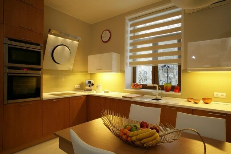 Cu ajutorul perdelelor luminoase, puteți schimba în mod de necunoscut interiorul bucătăriei